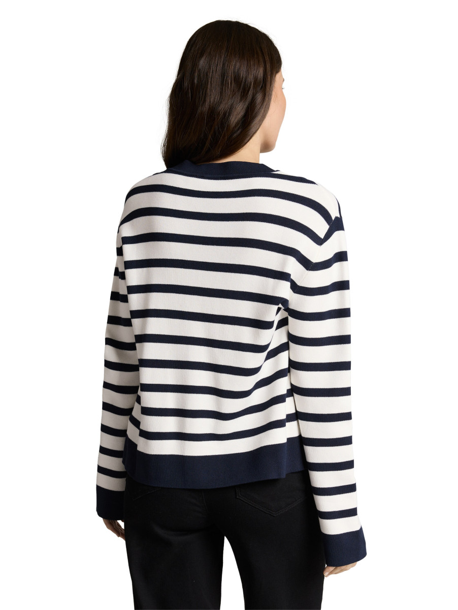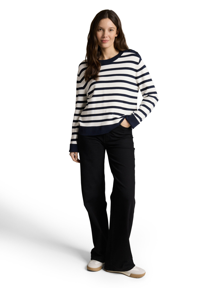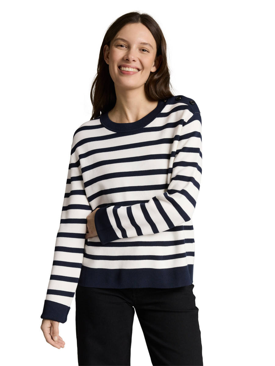 Gestreifter Pullover mit Rundhalsausschnitt und dekorativen Knopfdetails an der Schulter. Der klassische Schnitt sorgt für einen angenehmen Sitz und lässt sich vielseitig kombinieren. Ein zeitloses Basic, das sich hervorragend für den Alltag und entspannte Looks eignet.Lief.-Art-Nr: 1050538