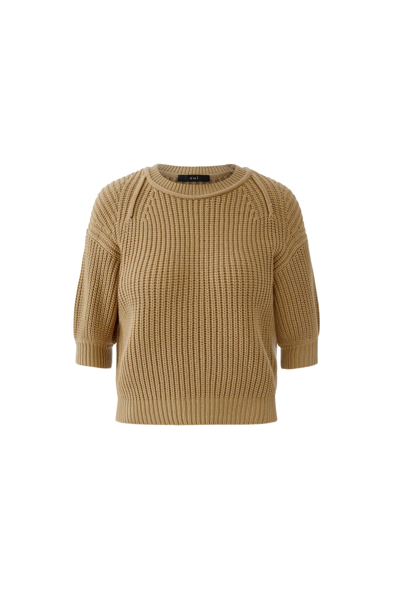 Der legere, verkürzte Pullover aus weicher Baumwollmischung überzeugt mit breiter Rippenstruktur und schmeichelhafter Passform. Der Rundhalsausschnitt mit dekorativer Rollkante und die weiten Halbärmel mit feinen Rippbündchen sorgen für einen modernen Look und angenehmen Tragekomfort. Der kontrastierende Saum in kleiner Rippe rundet das Design ab und macht den Pullover zu einem vielseitigen Begleiter für entspannte Alltagsoutfits.Lief.-Art-Nr: 0096758