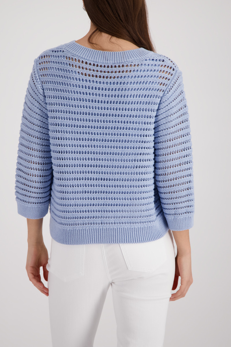 Moderner Ajour-Strickpullover aus 100% Baumwolle mit elegantem Rundhalsausschnitt und lässigen ¾-Ärmeln.Lief.-Art-Nr: 410861