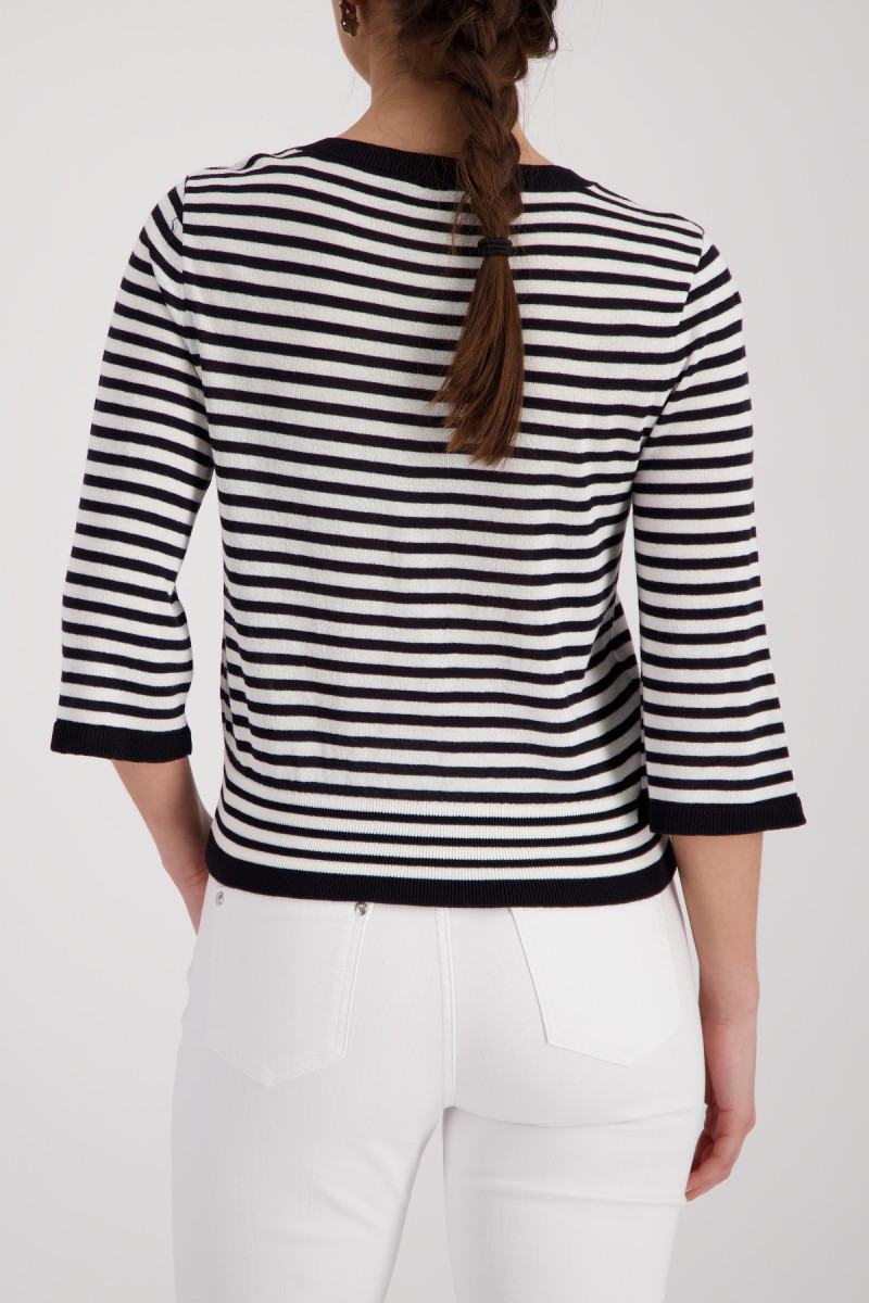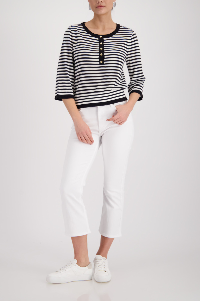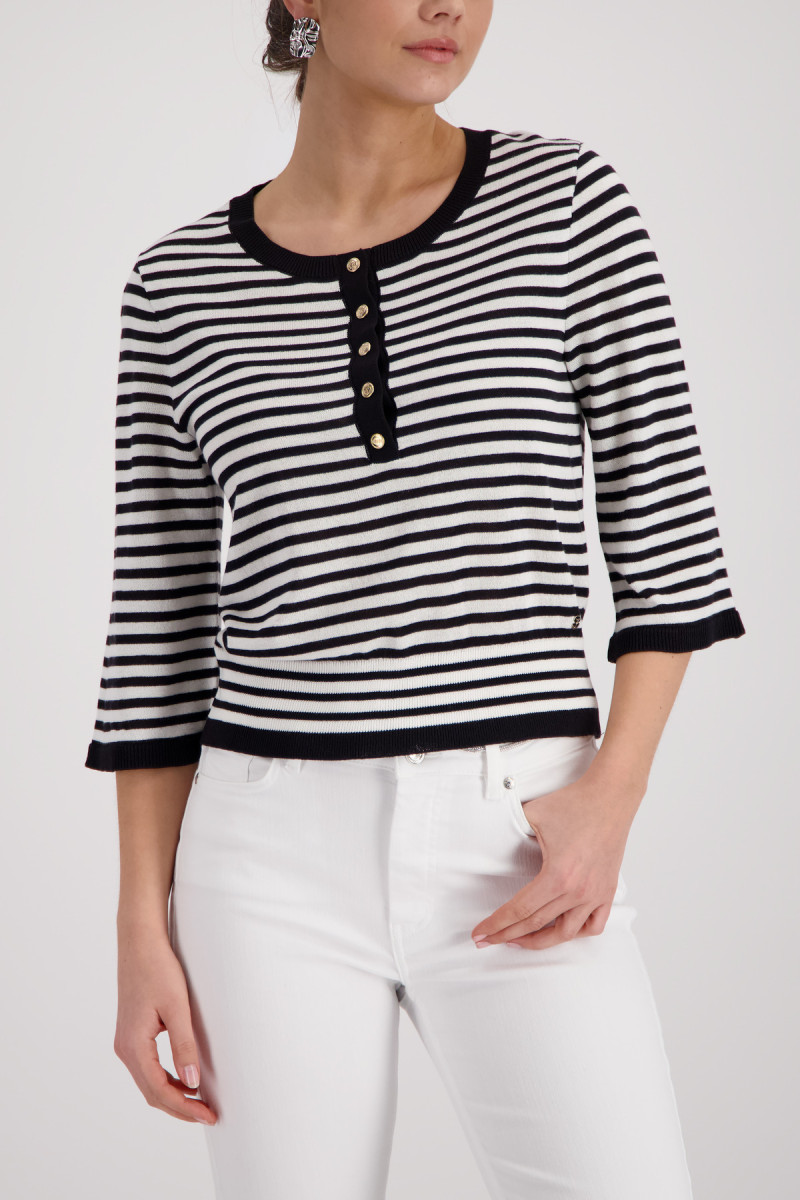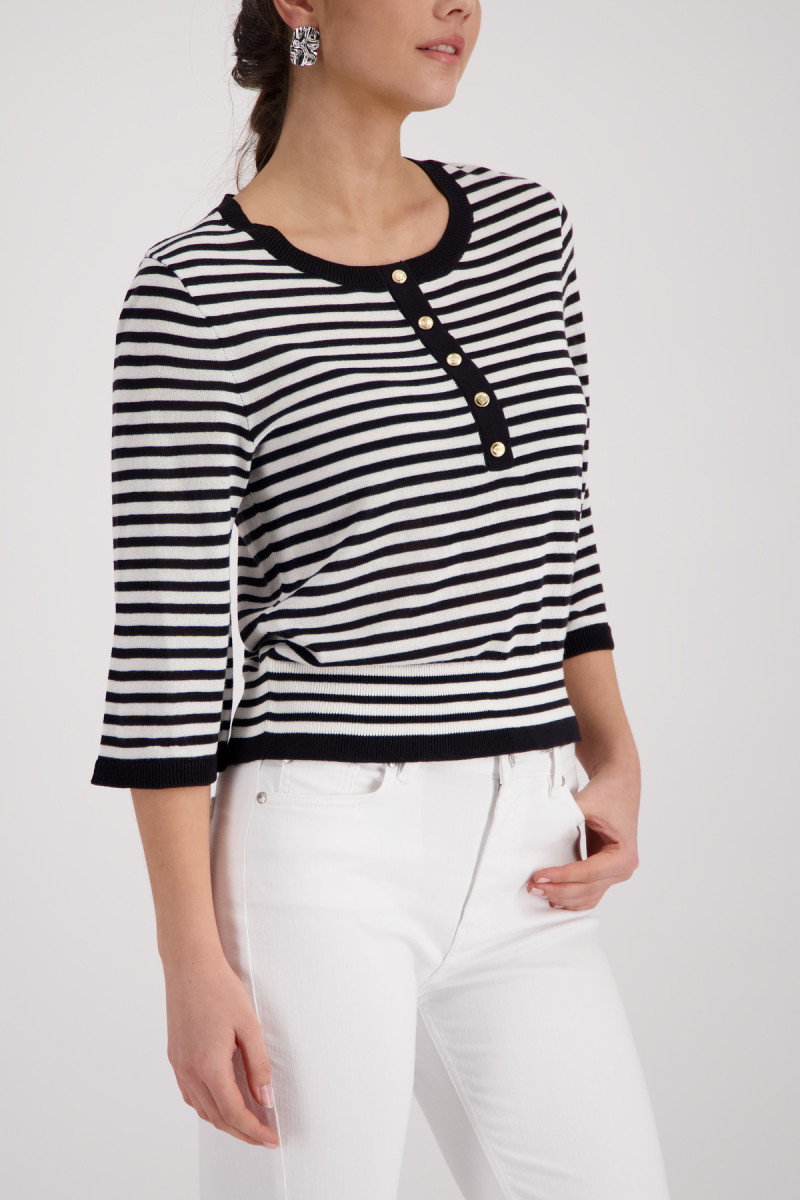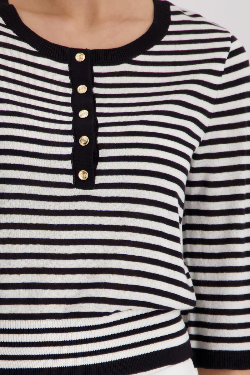 Eleganter Pullover aus einer fließenden Viskose mit modischen Streifen, Rundhalsausschnitt und ¾-Ärmeln, verziert durch eine Schmuckknopfleiste.Lief.-Art-Nr: 410872