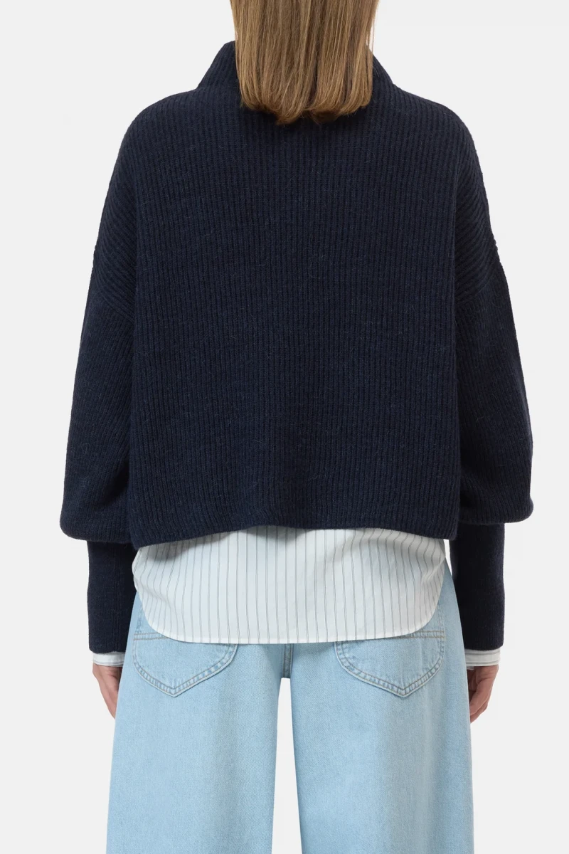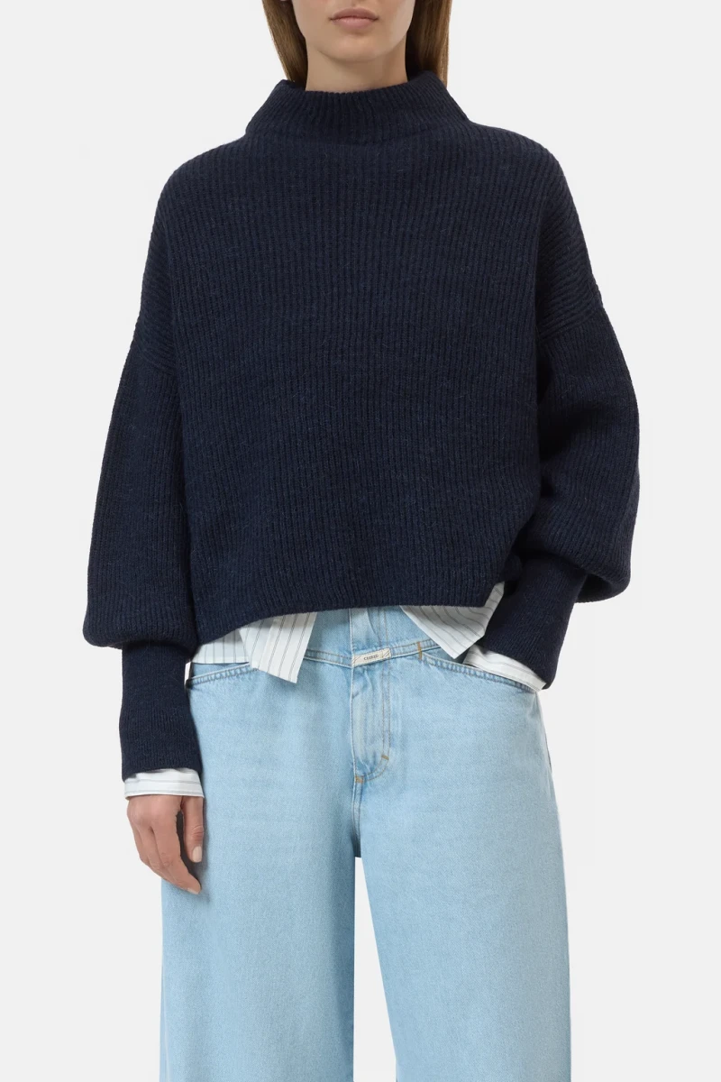 Aus weichem italienischem Alpaka-Mix-Garn: kurzer Strickpullover im Fisherman's Rib mit Stehkragen, überschnittenen Schultern und extra breiten Bündchen an den Ärmeln.