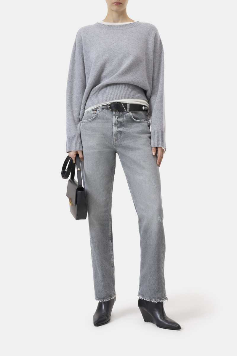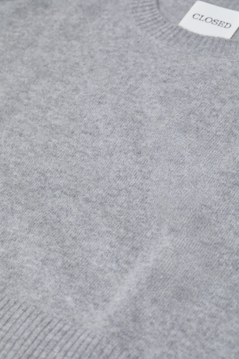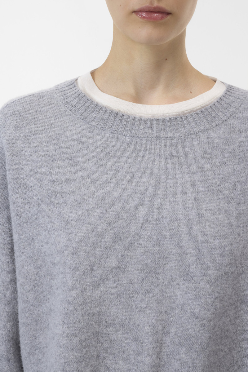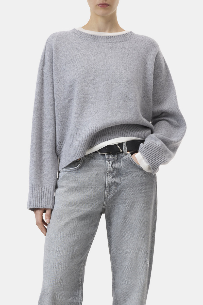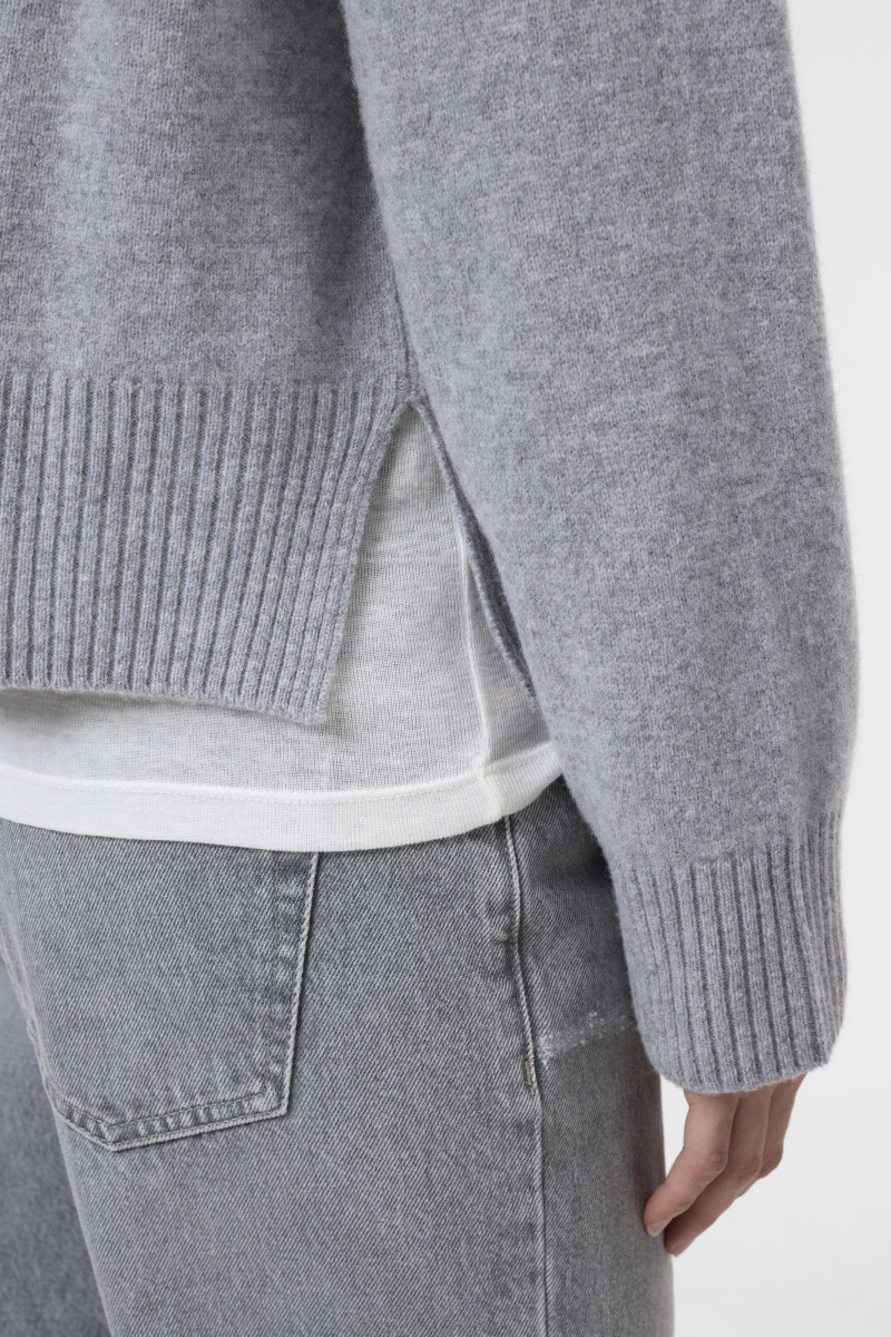 Rundhalspullover mit weitem Ärmel aus Merinowolle mit leichtem Overwash‑Effekt. Reguläre Passform mit Sattelärmeln, seitlichen Schlitzen im Saum und innovativen Strickstichen.