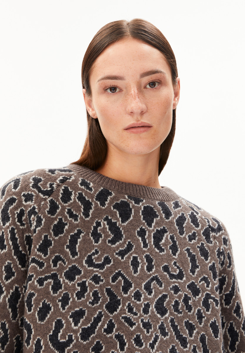 Unser DILIRIAA LEOPAA Strickpullover aus Grobstrick mit Jaquard Print hat einen kurzen, bequemen Schnitt. Er ist aus Bio-Wolle und recycelter Wolle gefertigt, wodurch er warm und weich bleibt.