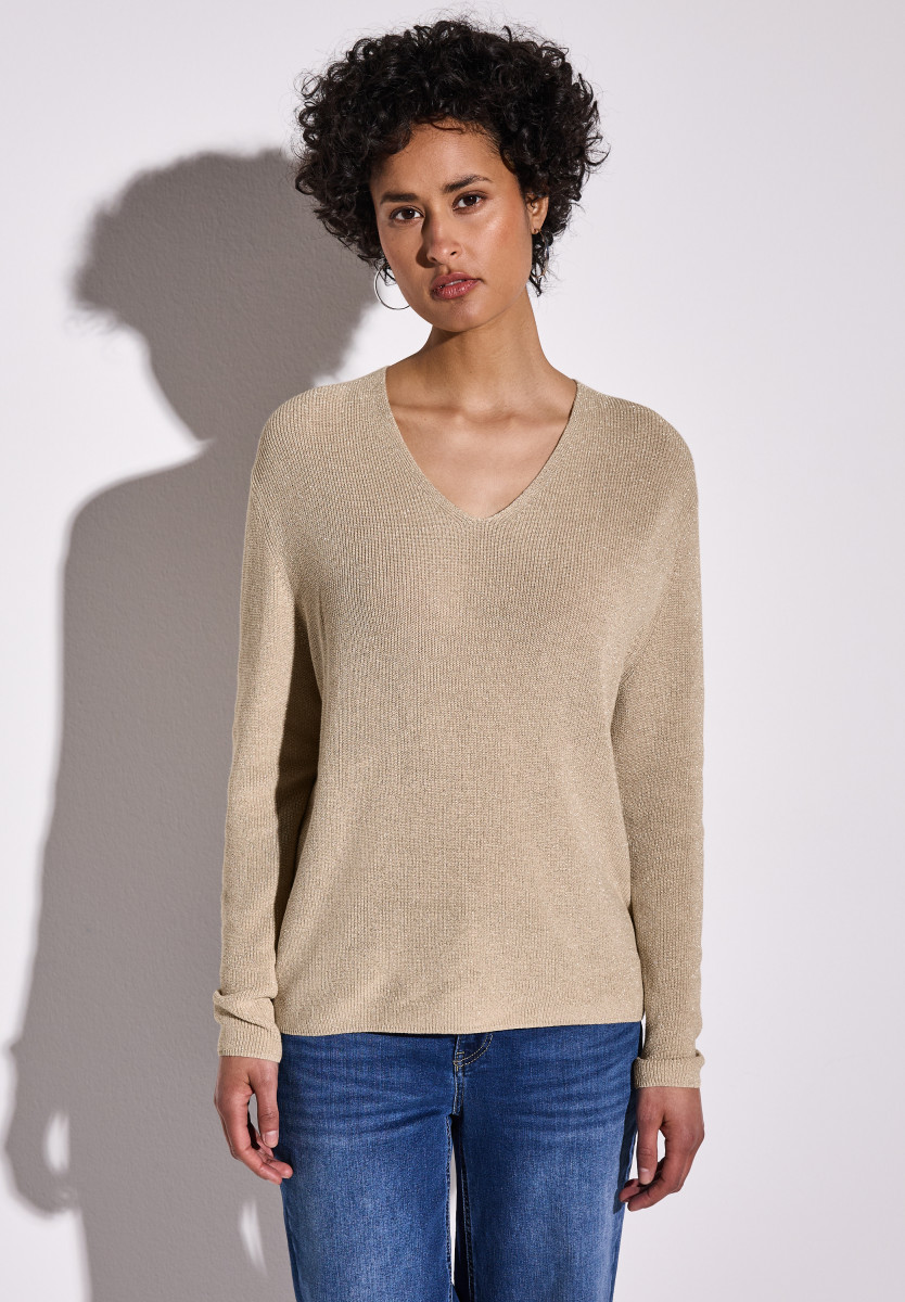 Dieser Strickpullover von Street One für Damen bringt mit glitzernden Details und einem V-Ausschnitt modische Details in deinen Alltag. Der angenehme Baumwollmix sorgt für hohen Tragekomfort. Strickpullover V-Ausschnitt Langarm Glitzernde Details Angenehmer Baumwollmix