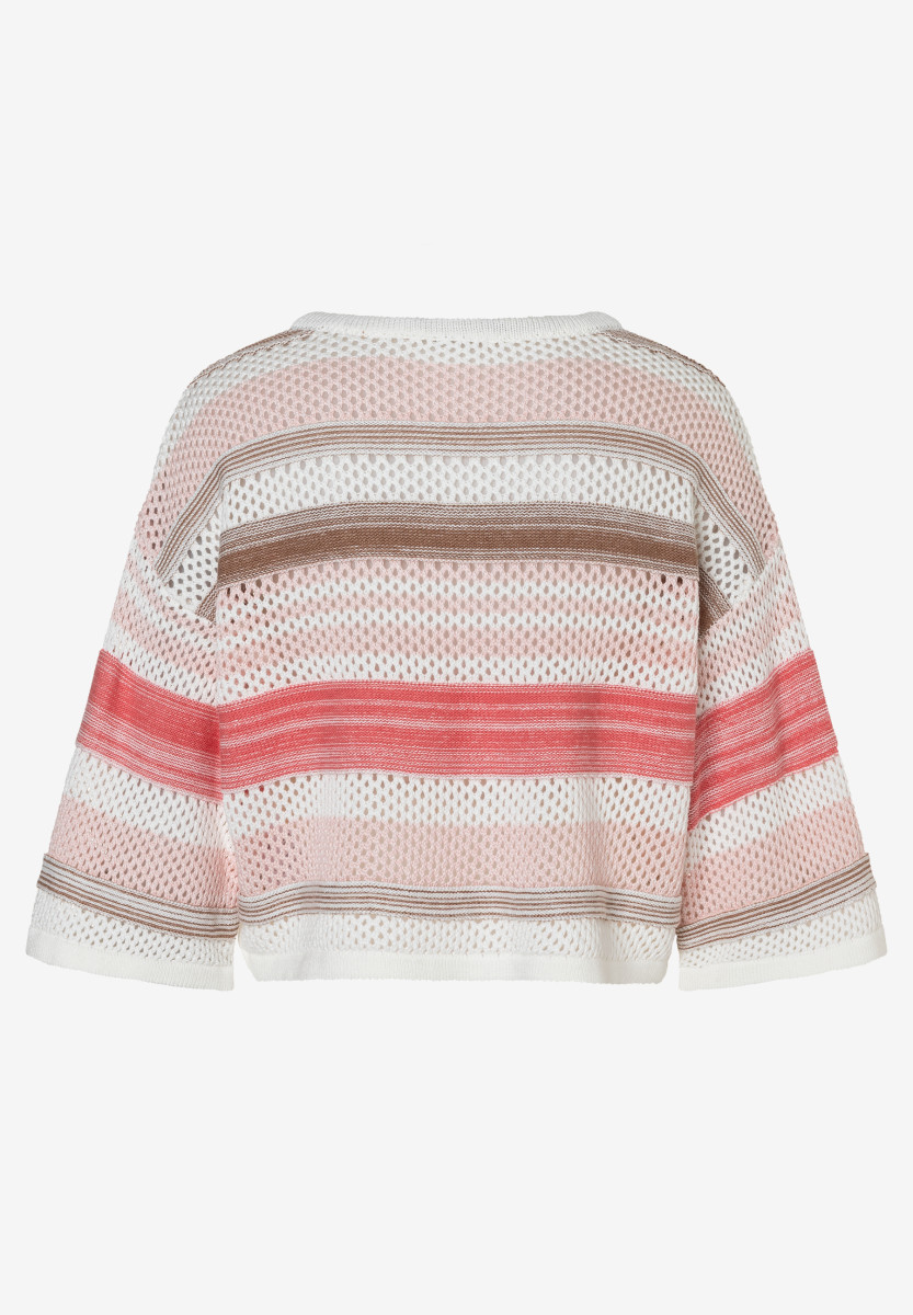 Dieser luftige Pullover von MORE & MORE überzeugt mit weichem Material und modernem Streifenmuster in sanften Rosé- und Naturtönen. Der lockere Schnitt, 3/4-Ärmel und der V-Ausschnitt sorgen für eine entspannte, feminine Silhouette. Ideal für vielseitige Looks – von casual bis elegant.