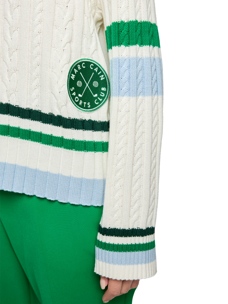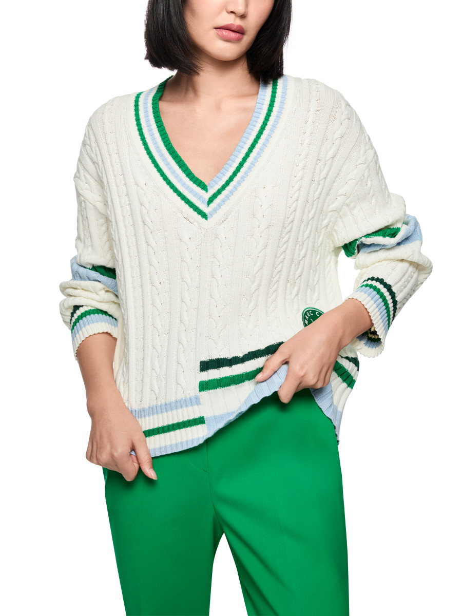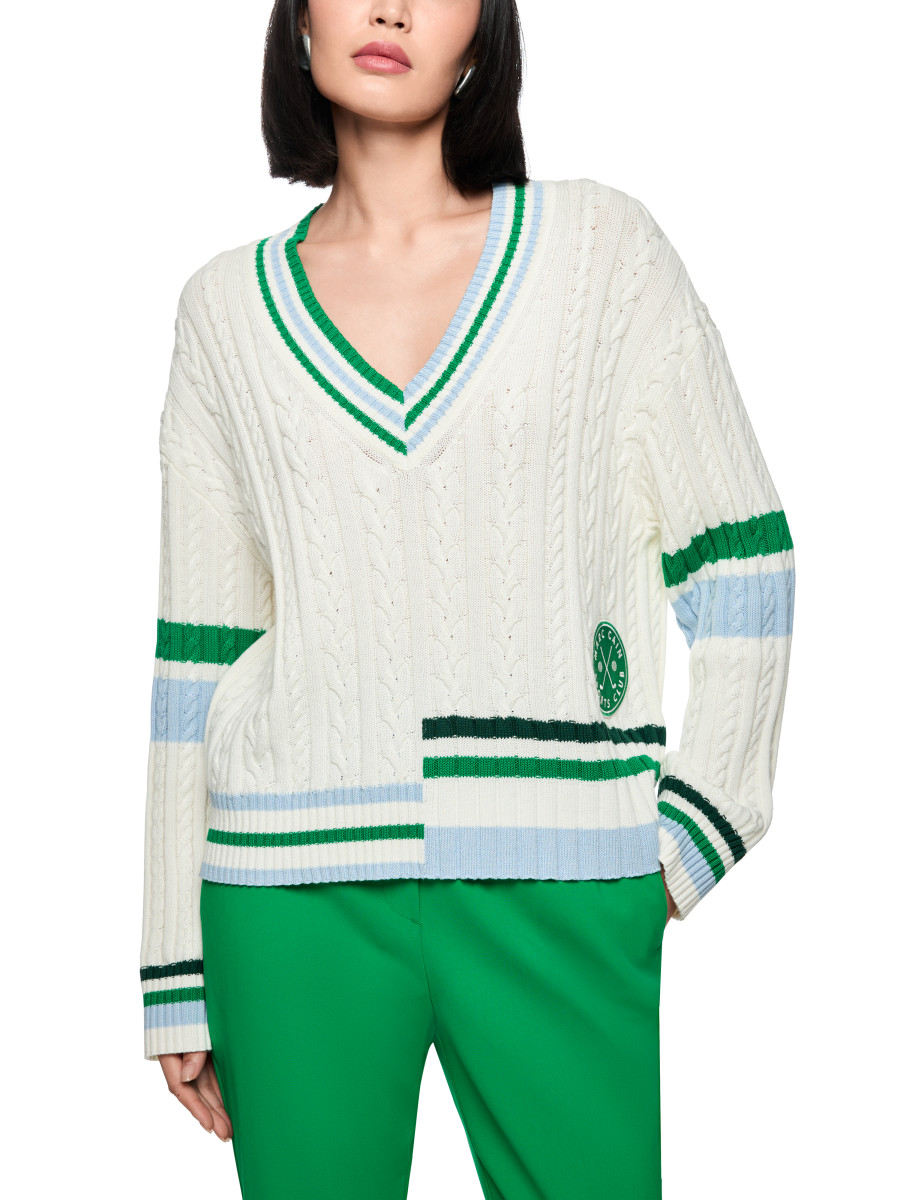 Der lockere Damenpullover Rethink Together überzeugt mit einem modernen V-Ausschnitt und einem klassischen Zopfmuster. Elegante Ringel in verschiedenen Breiten und ein dezenter Sports Club Patch setzen stilvolle Akzente, während die entspannte Passform hohen Tragekomfort bietet. Der Pullover besteht aus einem Baumwolle-Wolle-Mix und trägt das Nachhaltigkeitslabel 'Rethink Together'.Lief.-Art-Nr: AS 41.19 M66