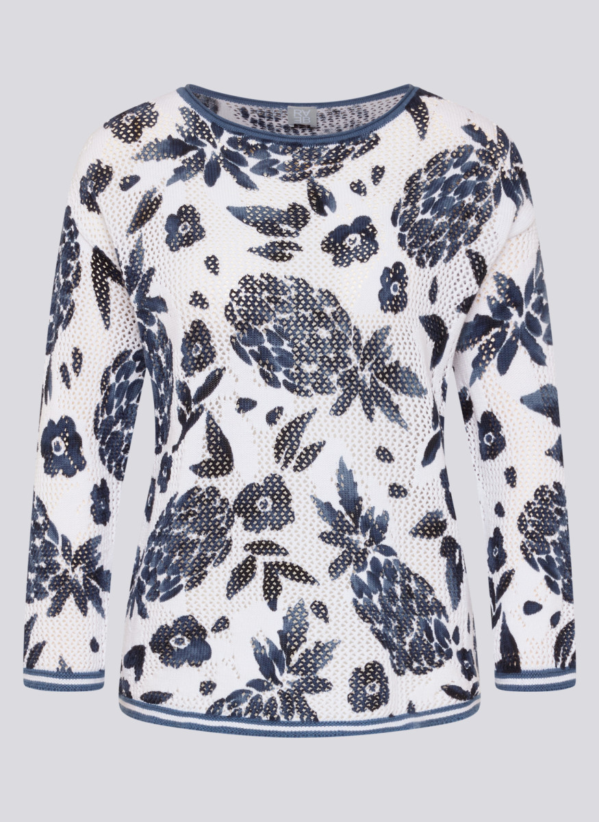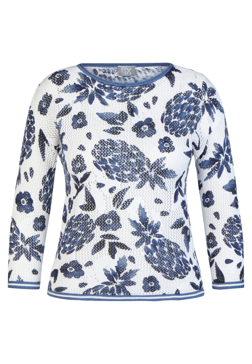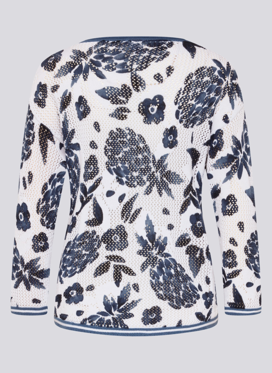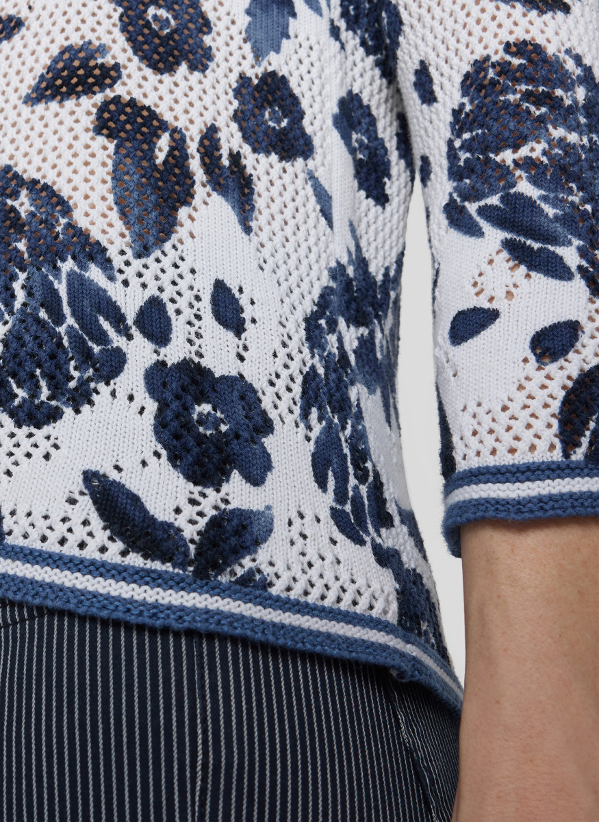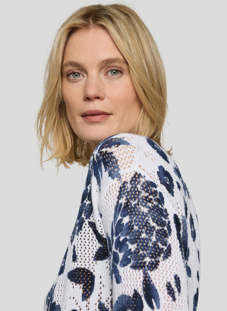 Die feine Lochstruktur verleiht diesem Strickshirt eine luftige, lebendige Oberfläche. Florale Motive setzen einen dekorativen Akzent und unterstreichen den sommerlichen Charakter. Der klassische Rundhalsausschnitt und die 3/4-Ärmel sorgen für eine zeitlose, unkomplizierte Optik. Die leichte Baumwollqualität trägt sich angenehm und eignet sich ideal für warme Tage. Reine Baumwolle. Luftige Lochstruktur. Floraler Allover-Print. Rundhalsausschnitt. 3/4-Ärmel.Lief.-Art-Nr: 56-121604