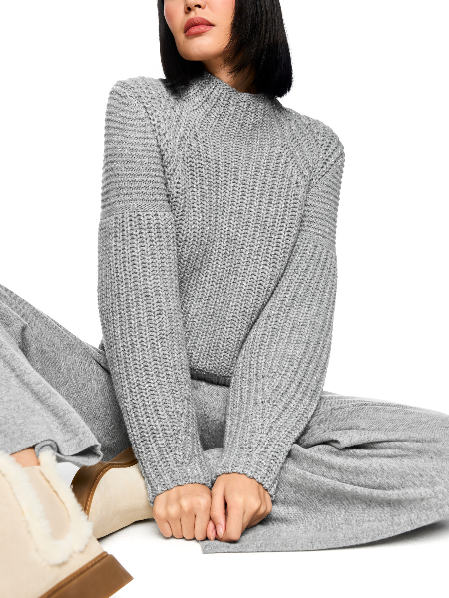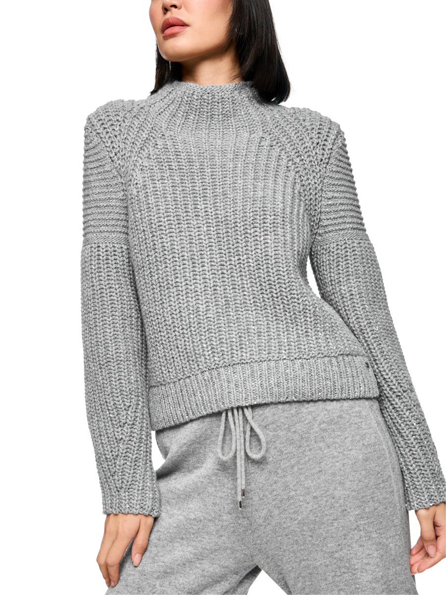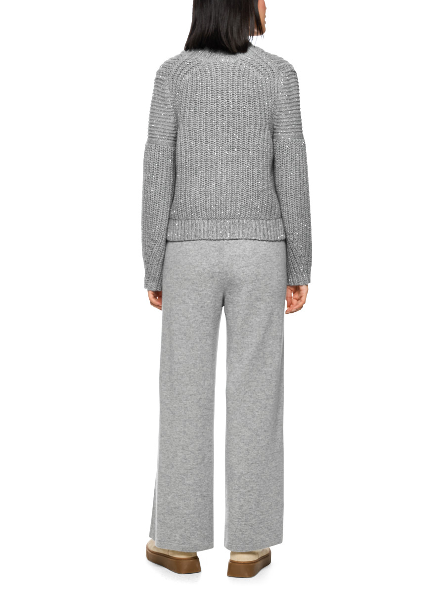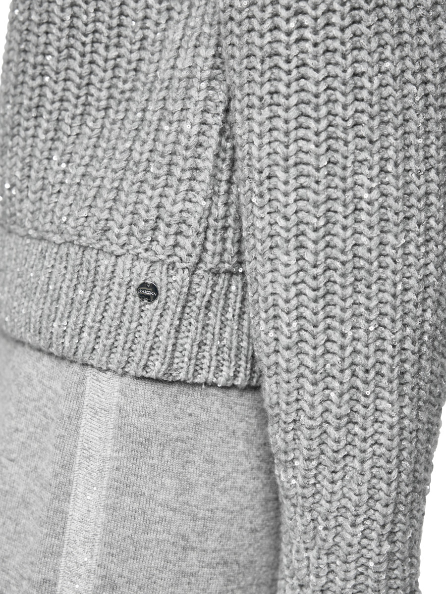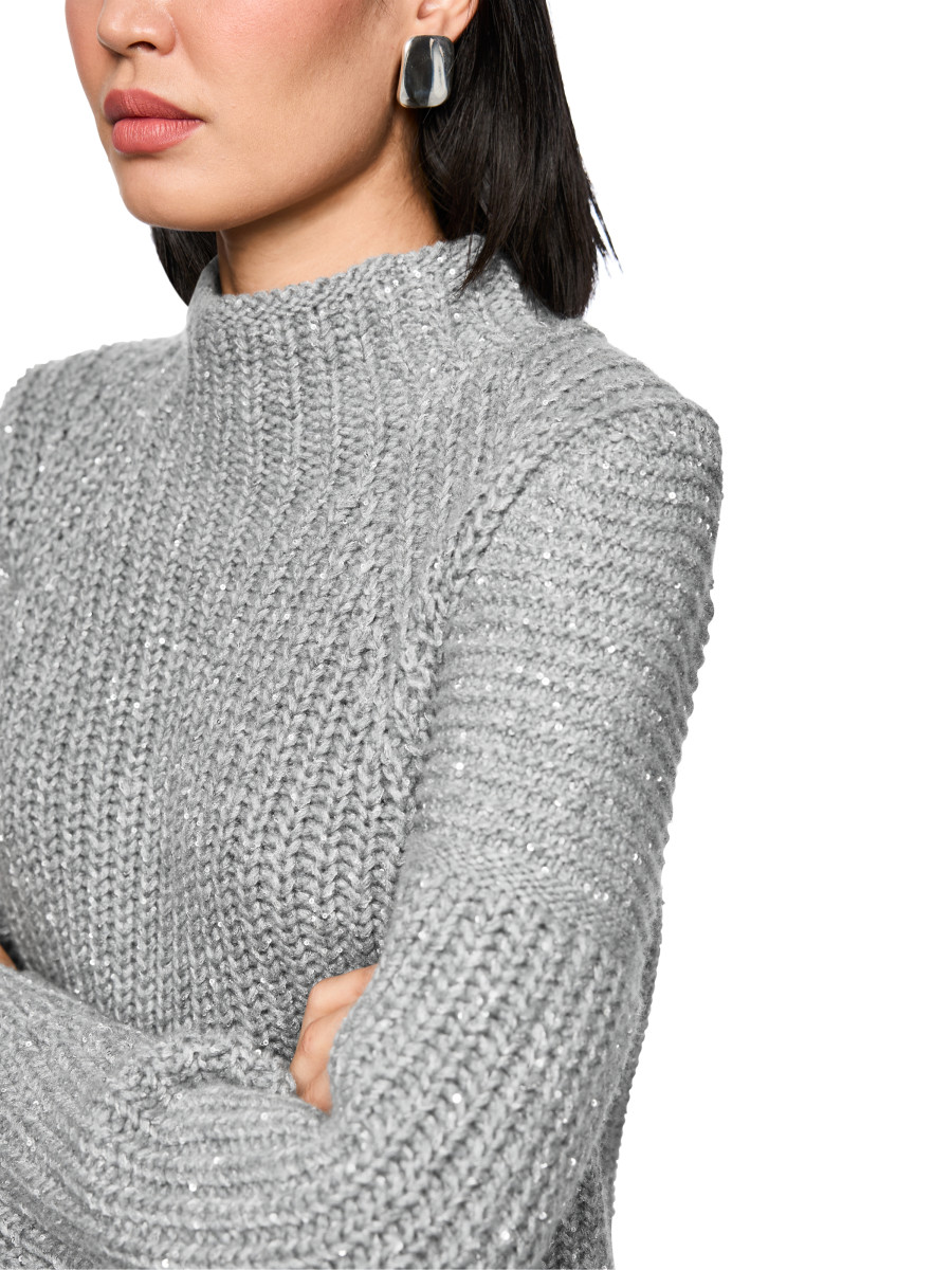 Highlight dieses Strickpullovers sind die eingearbeiteten Pailletten, die ihm einen schimmernden Look verleihen. Der Pullover kommt mit leichtem Stehkragen, geradem Schnitt und einem weichen Materialmix mit Wolle und Kaschmir. Das macht ihn zu einem zeitlosen Klassiker, der zu jedem Anlass passt. Er wird am Standort Deutschland gestrickt und auch veredelt. Die Weiterverarbeitung der einzelnen Teile erfolgt in europäischen Partnerbetrieben. Damit ist das Modell „Knitted in Germany“.