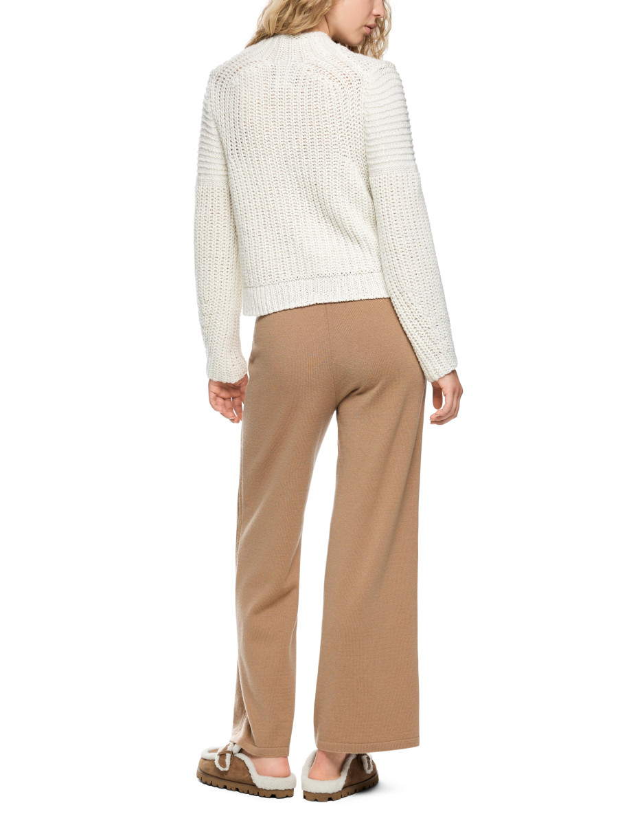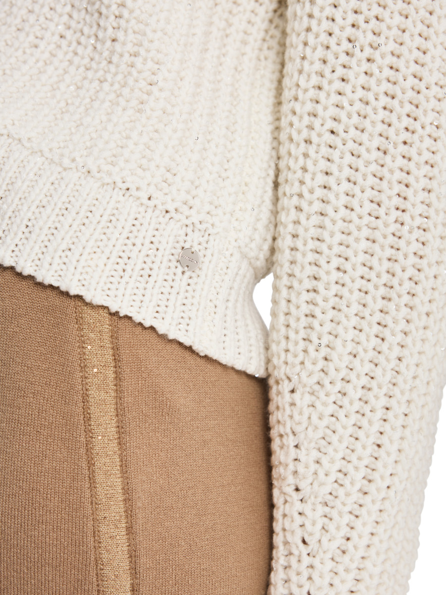 Highlight dieses Strickpullovers sind die eingearbeiteten Pailletten, die ihm einen schimmernden Look verleihen. Der Pullover kommt mit leichtem Stehkragen, geradem Schnitt und einem weichen Materialmix mit Wolle und Kaschmir. Das macht ihn zu einem zeitlosen Klassiker, der zu jedem Anlass passt. Er wird am Standort Deutschland gestrickt und auch veredelt. Die Weiterverarbeitung der einzelnen Teile erfolgt in europäischen Partnerbetrieben. Damit ist das Modell „Knitted in Germany“.