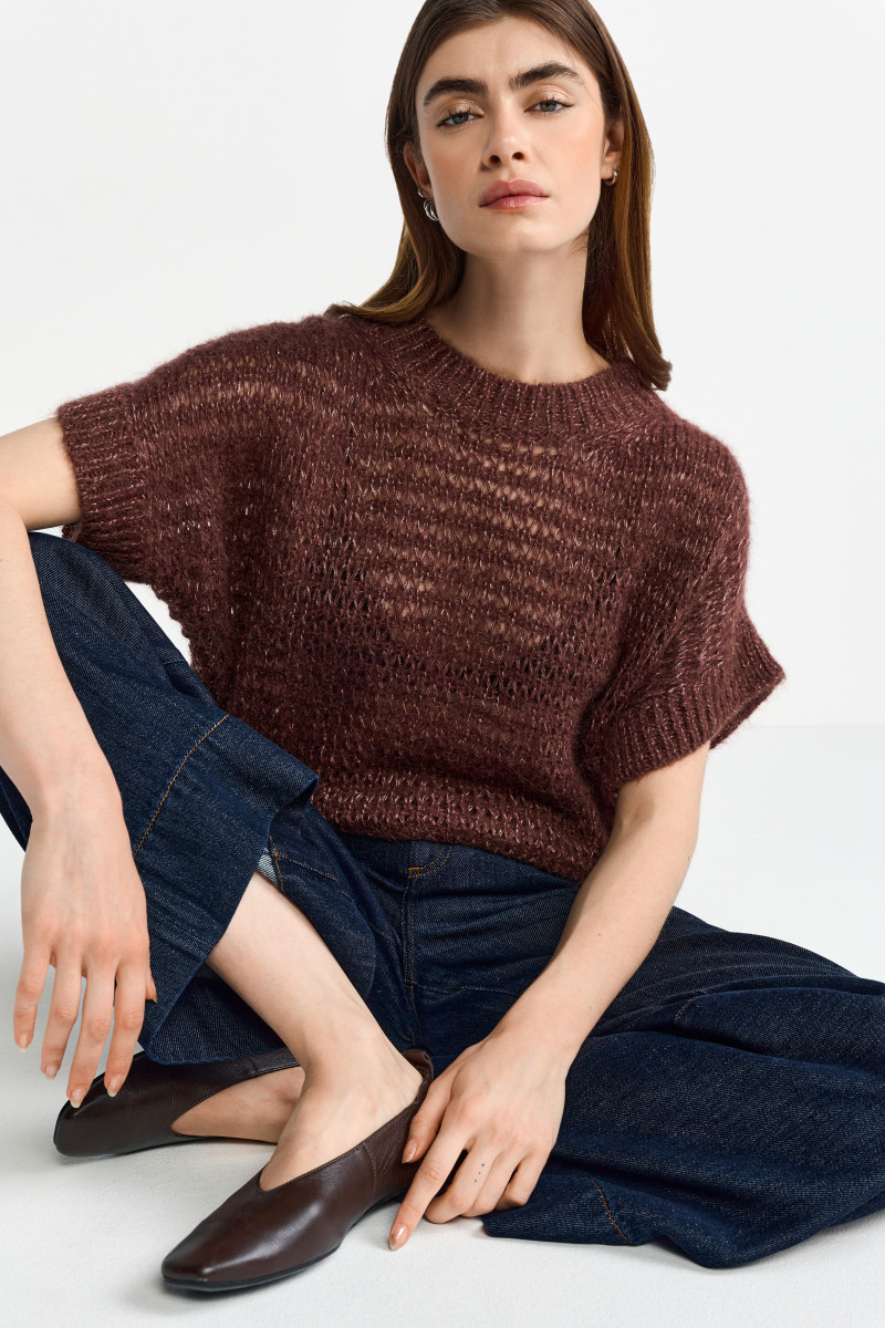 Dieser modische Oversized-Strickpullover überzeugt mit seinem lockeren Schnitt und der atmungsaktiven Maschenstruktur. Der weiche, braune Farbton sorgt für ein warmes und einladendes Gefühl, das perfekt in die kühlere Jahreszeit passt. Der runde Halsausschnitt und die kurzen Ärmel machen den Pullover zu einem angenehmen Begleiter für entspannte Tage oder als Layering-Piece für modische Outfits.