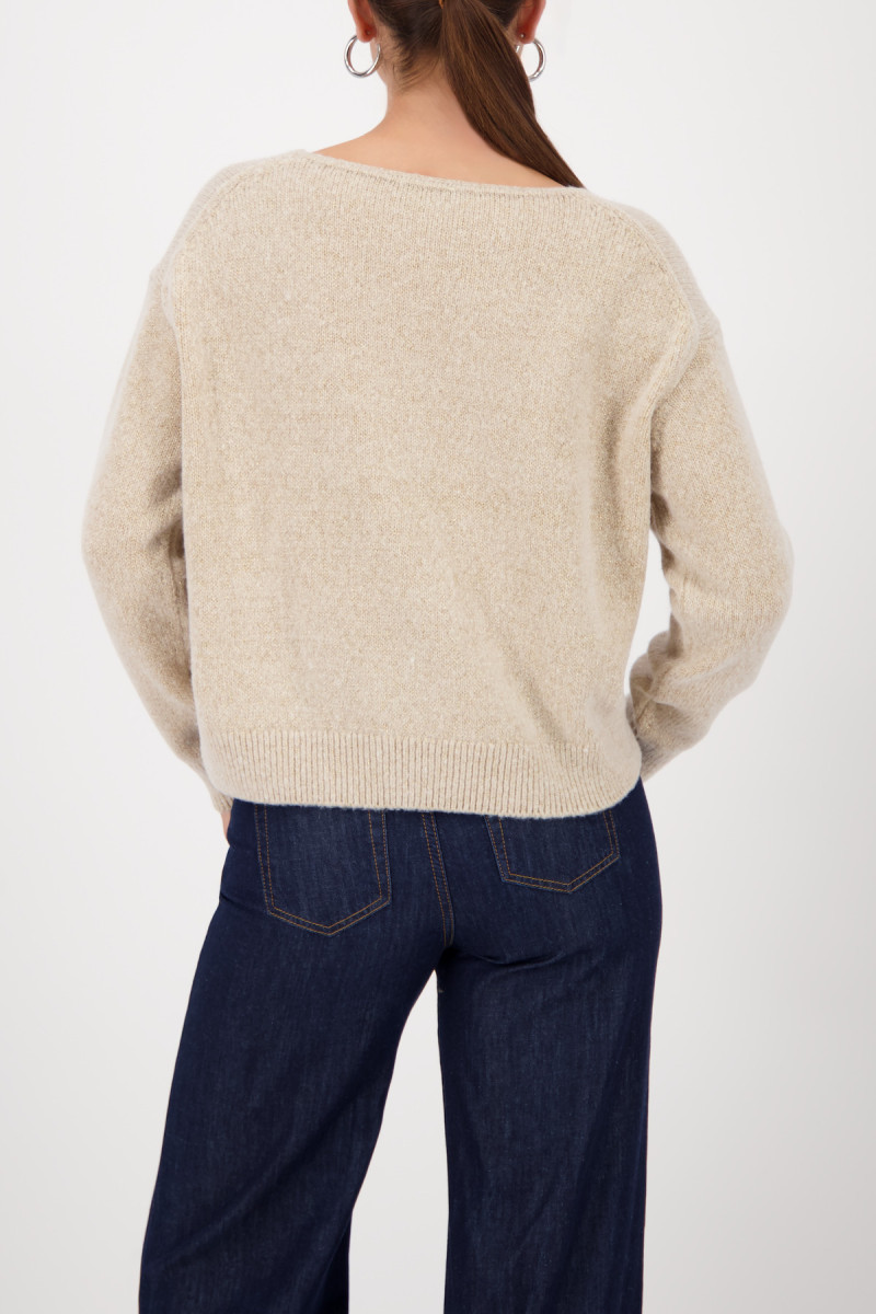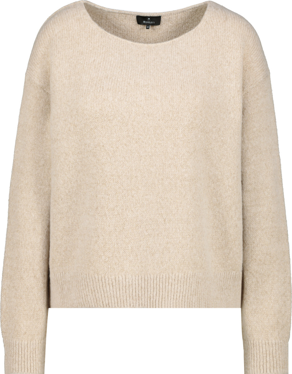 Eleganter Strickpullover aus einer hochwertigen Wollmischung mit glänzendem Lurex, weicher Haptik und leicht überschnittenen Schultern – ein stilvoller Begleiter.