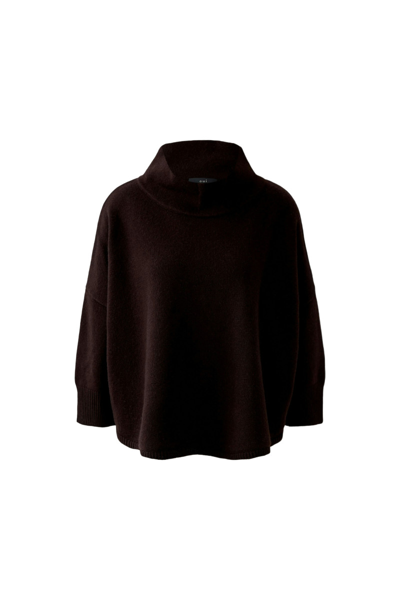 Weiche Garnmischung mit Wolle glatt gestrickt Oversized geschnitten, reguläre Länge Gedoppelter Stehkragen Stark überschnittene Schulter mit 7/8 Arm mit hohem Rippbündchen Gerundete Saumlinie | Länge bei Größe 36: 58cm