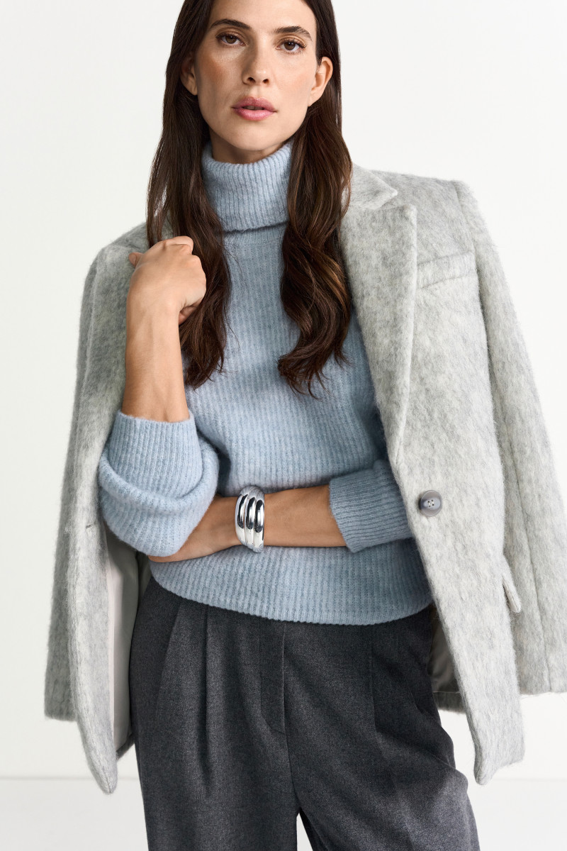 Dieser kuschelige Rollkragenpullover ist das Must-have für Ihre Herbst- und Wintergarderobe. Erleben Sie höchsten Tragekomfort vereint mit modernem, skandinavischem Design. Der Pullover präsentiert sich in einem zeitlosen, melierten Hellgrau, das sich vielseitig kombinieren lässt und eine beruhigende Eleganz ausstrahlt.