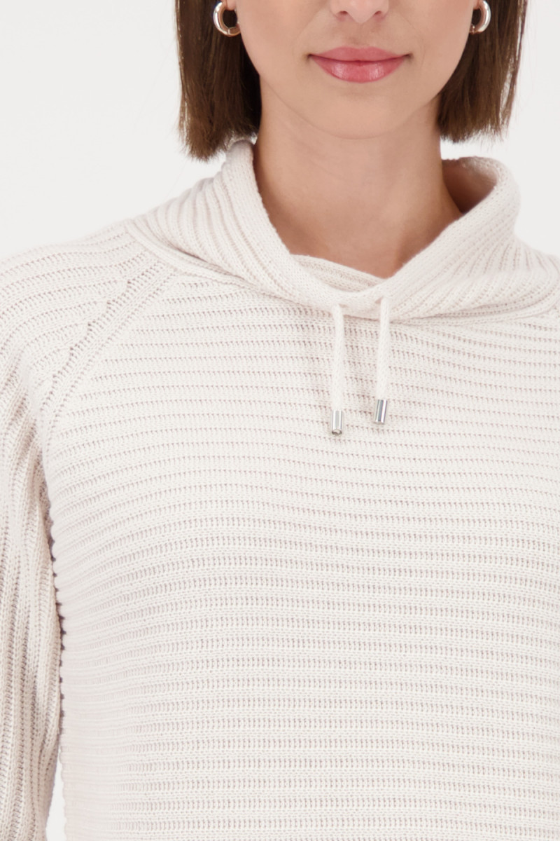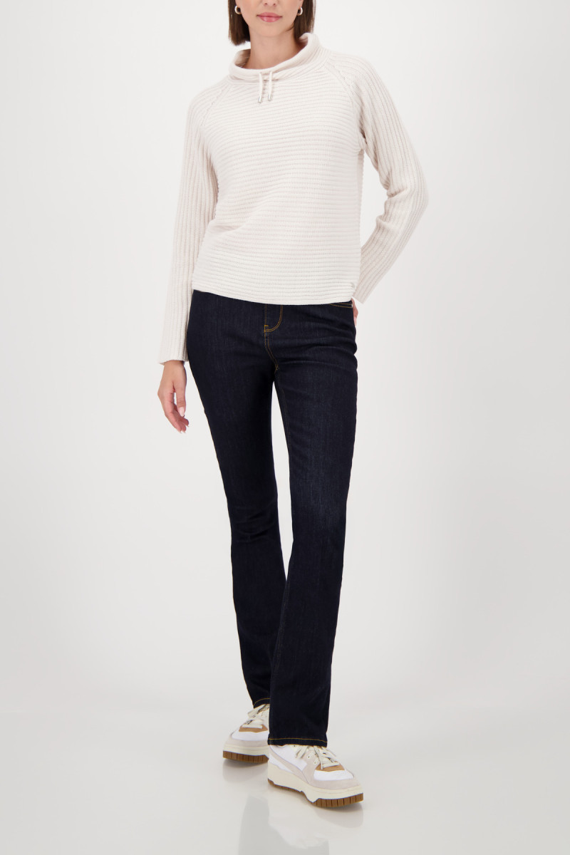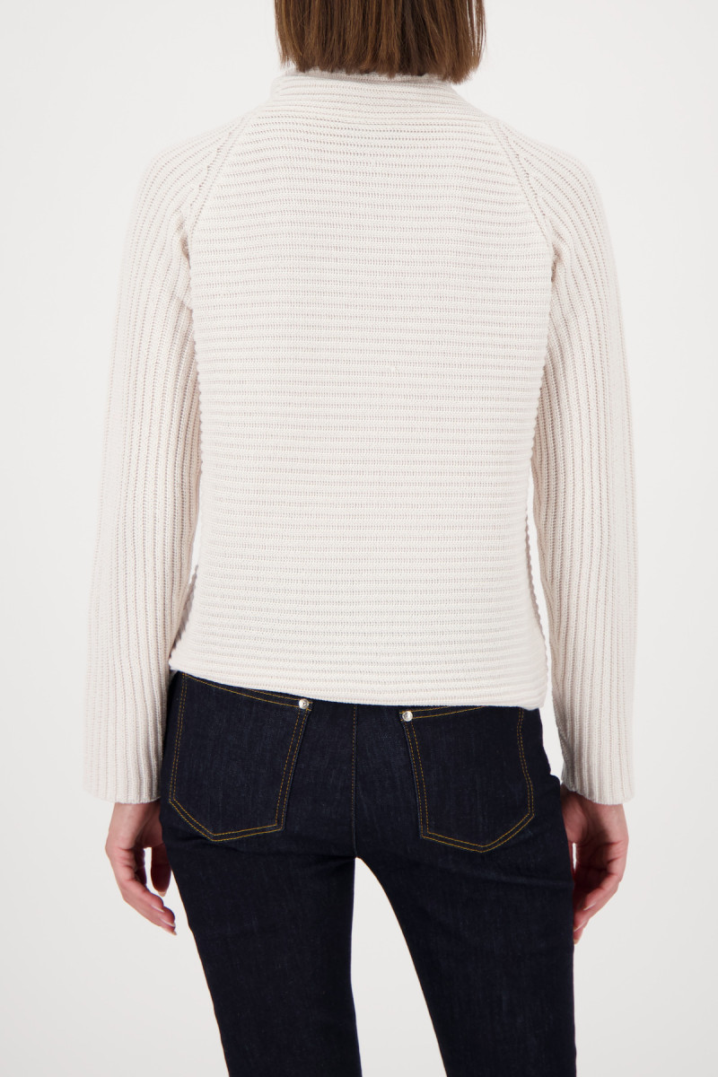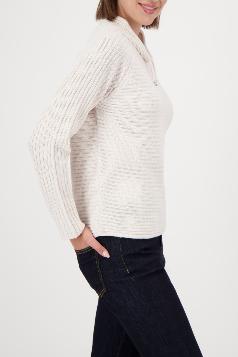 Der Pullover besticht durch sein zeitloses Design mit patentierter Querrippe und einem modischen Stehkragen mit Bindeband.