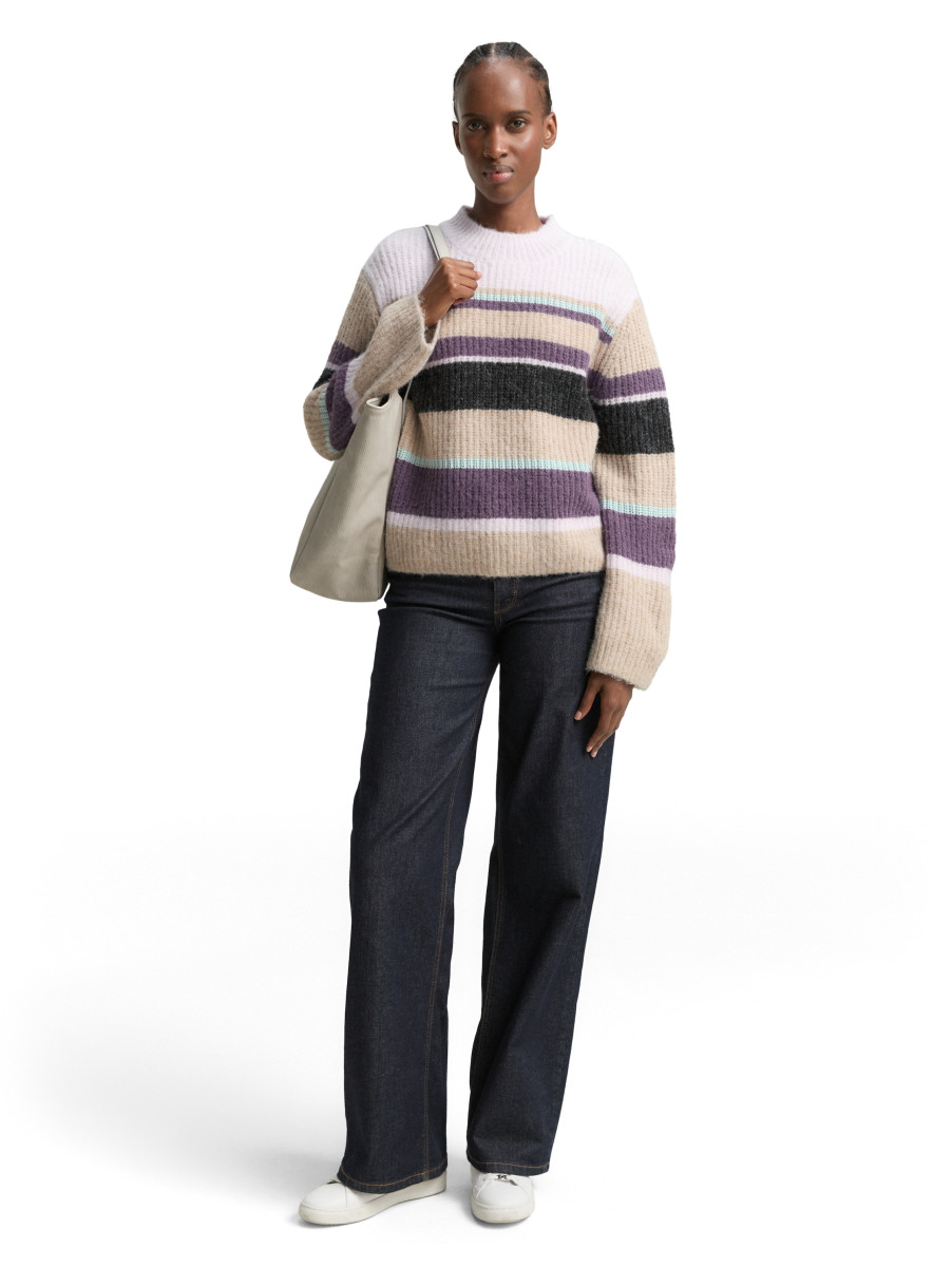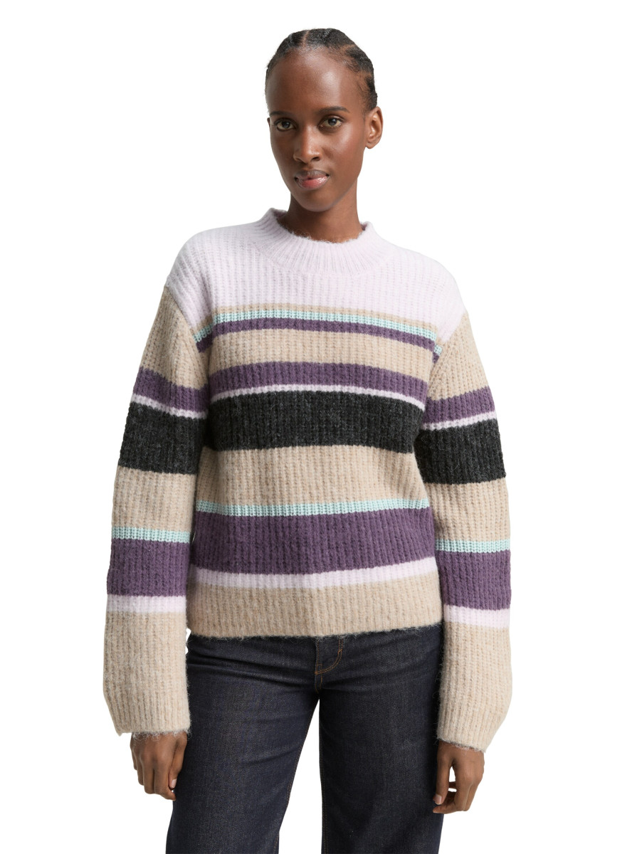 Gestreifter Pullover mit Stehkragen und leicht überschnittener Schulternaht für eine lockere Passform