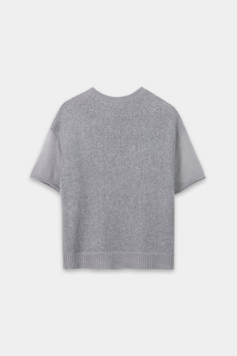 Halbarm-Pullover aus weicher, luftig verstrickter Woll-Mischung mit Rundhalsausschnitt und überschnittener Schulterpartie. Ein kontrastfarbenes Unterteil mit funkelnden Paillettenbesatz sorgt für einen raffinierten Layering-Look mit Glanzeffekt. Unser Model ist 178 cm groß und trägt Größe 36.