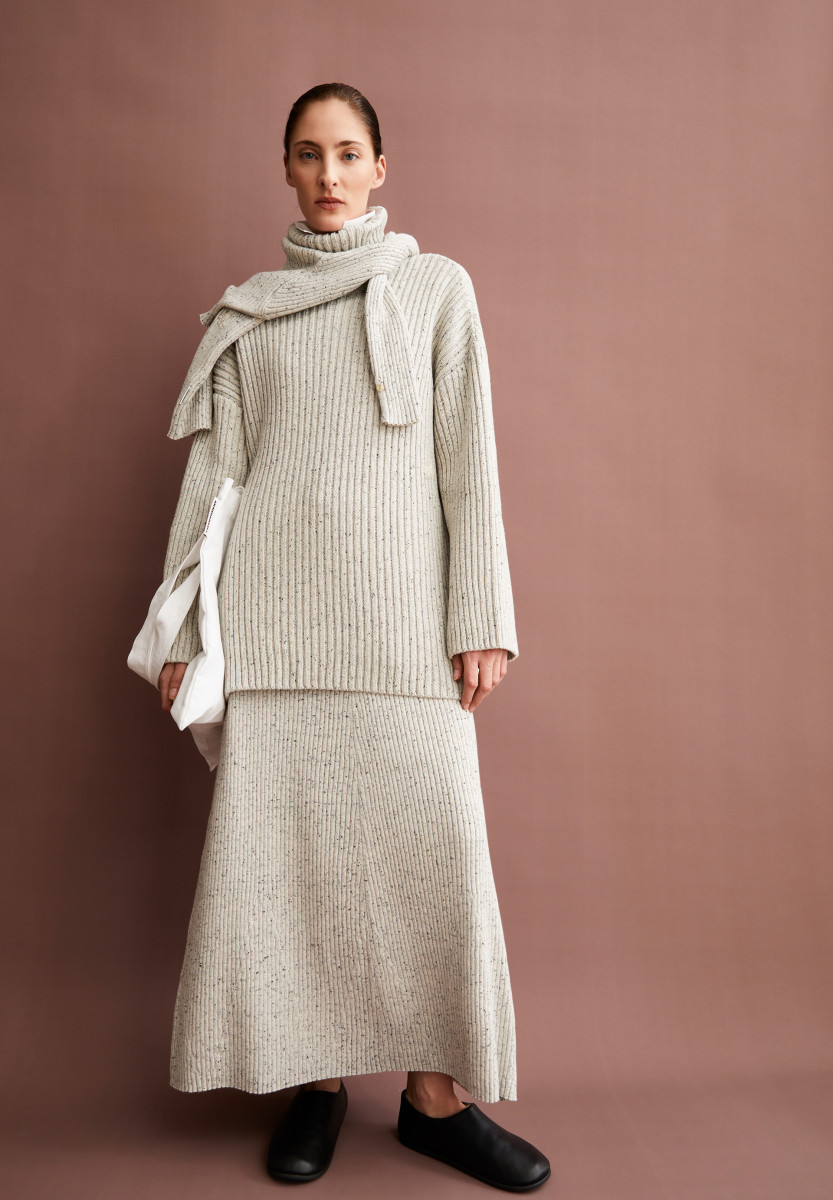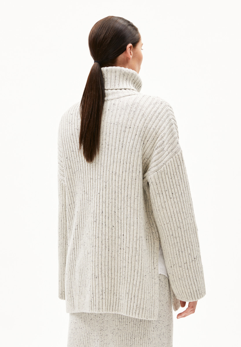 Das gestreifte Rollkragenshirt dient als ideale, wärmende Unterschicht unter dem SABIRAA TWEED Pullover. Dieser zeichnet sich durch seine entspannte Passform ("relaxed fit") und eine grobe Mouliné-Strickstruktur aus, die dem Gesamtlook Tiefe und Textur verleiht. Der breite Rollkragen des Pullovers ergänzt den legeren Charakter perfekt.