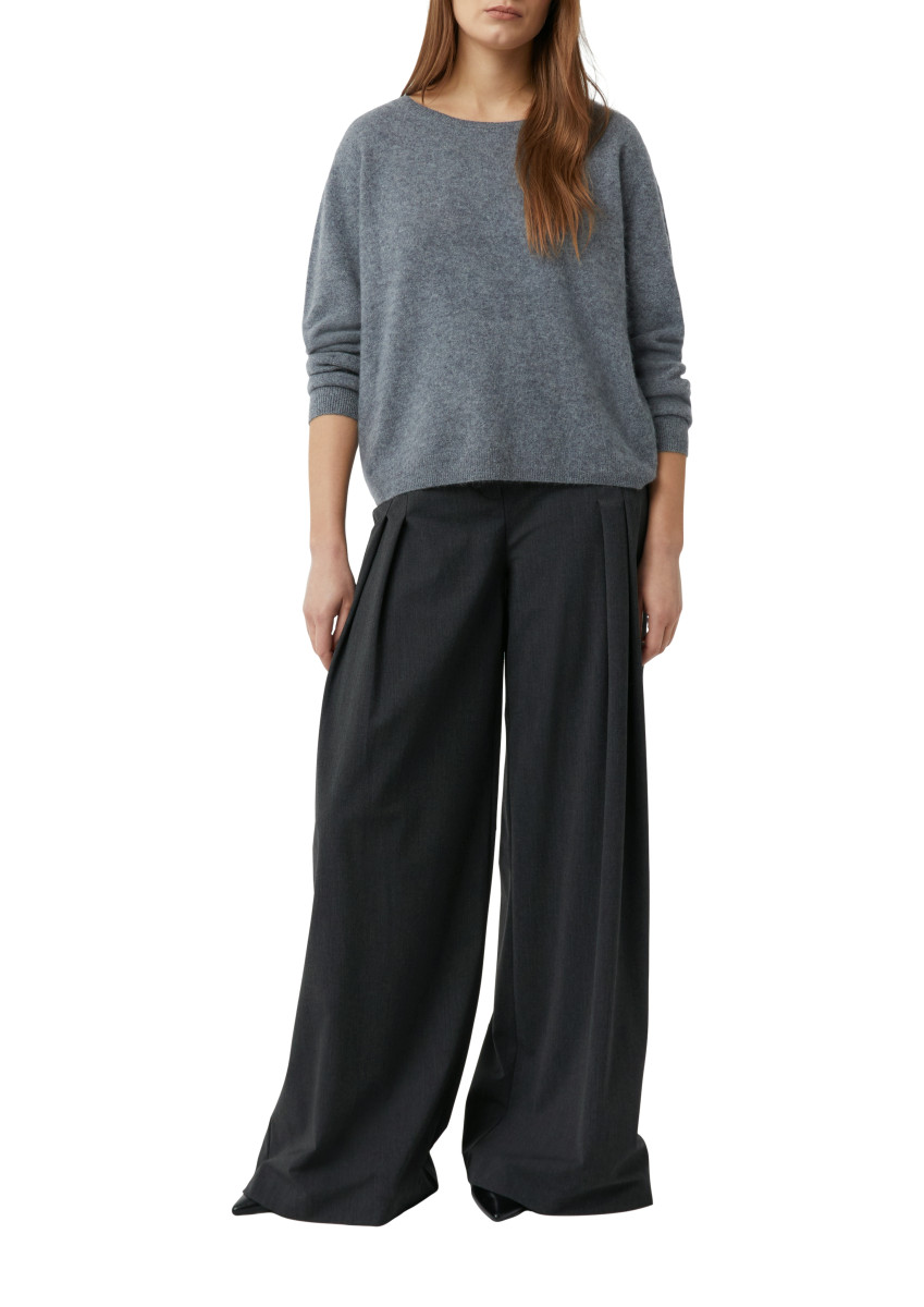 Der Pullover präsentiert sich in einer klassischen, leicht lockeren Passform, die eine entspannte und zugleich gepflegte Silhouette schafft. Der schlichte, weite Rundhalsausschnitt macht ihn vielseitig kombinierbar und ermöglicht es, darunter einen Kragen oder ein Hemd zu tragen.