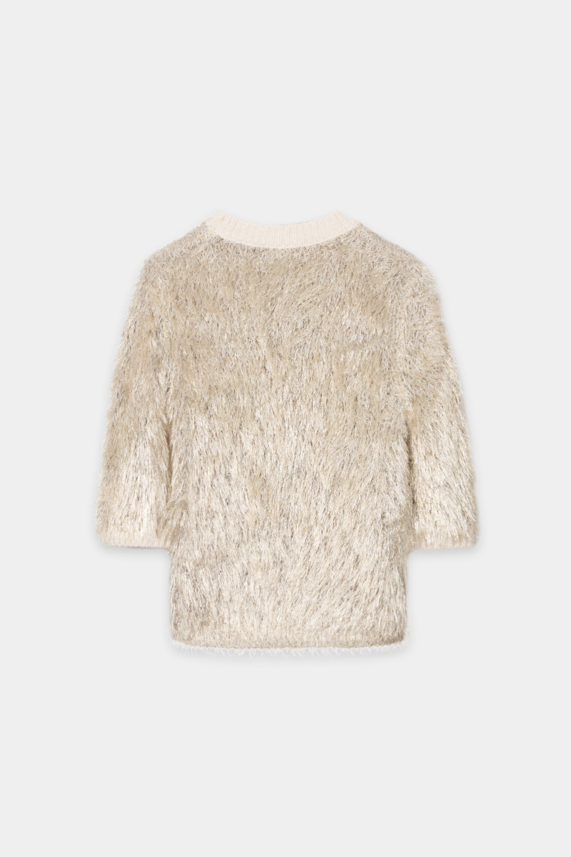 Pullover aus hochwertigem, italienischem Fake-Fur-Garn mit Rundhalsausschnitt und halblangen Ärmeln. Das eingearbeitete Glanzgarn verleiht dem Pullover einen luxuriösen Touch. Unser Model ist 178 cm groß und trägt Größe 36. Handwäsche