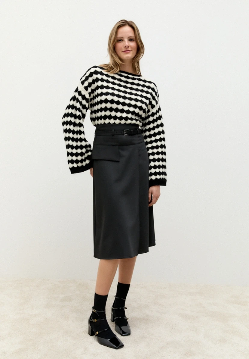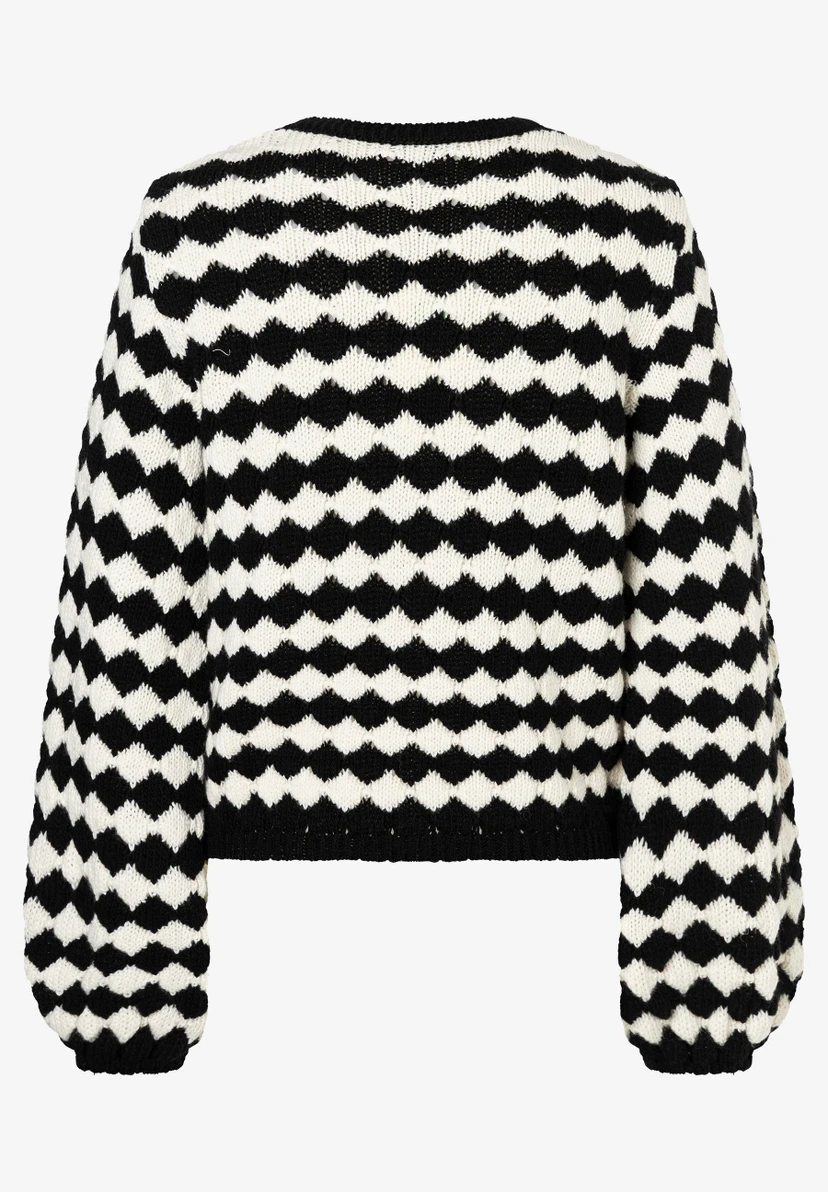 Kurze, lockere Form | Runder Ausschnitt | Lange, voluminöse Ärmel | Schmale Rippstrickbündchen an den Abschlüssen | Kontrastfarbiges Streifenmuster | Material-Mix