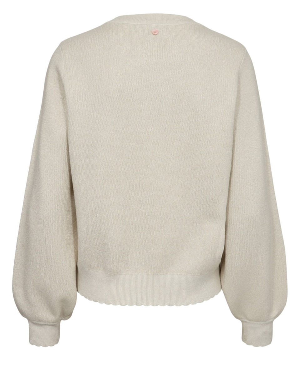 Der Pullover präsentiert sich mit einem klassischen Rundhalsausschnitt und einer regulären Passform, die für einen bequemen und dennoch schicken Look sorgt. Ein besonderes Merkmal sind die weiten, leicht bauschigen Ärmel (Balloon-Sleeves), die in schmalen, gerippten Bündchen enden und der Silhouette eine modische Dramatik verleihen.
