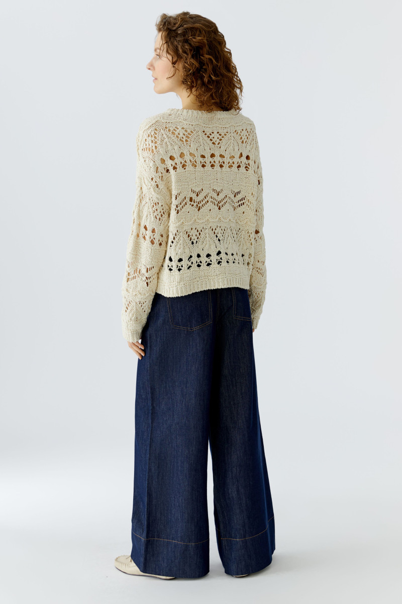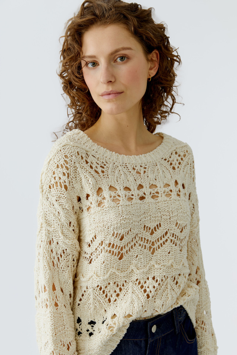 Bewegte Baumwollmischung in Bouclé Optik, leicht transparent Lässig geschnitten, verkürzte Länge Großzügiger Rundhals mit Strickbündchen Überschnittene Schulter, fällt locker zum Langarm Strickbündchen am Ärmel und Saum | Länge bei Größe 36: 50cm