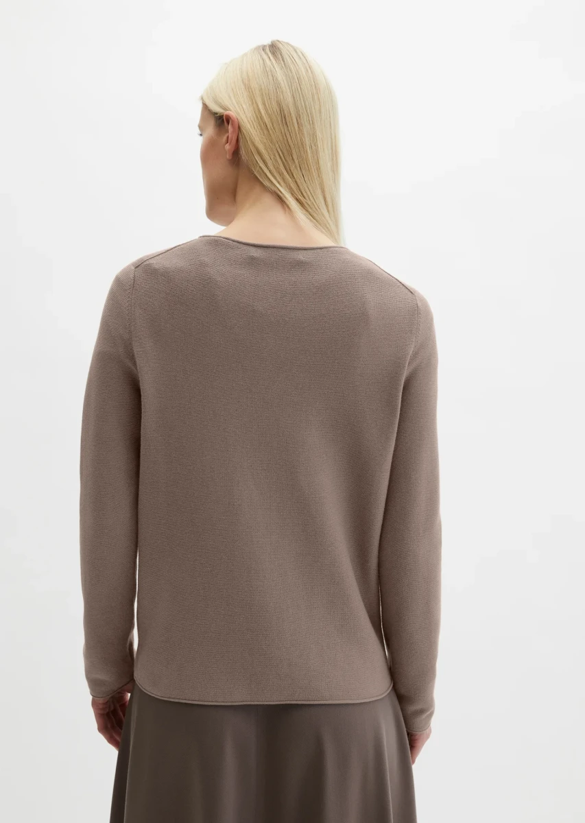 Der lässigste und sportlichste Allrounder der Stricksaison: der clean designte Pullover mit feinem Links-Links gestricktem Muster. Das Garn: eine exklusive, reine und weiche Organic Cotton-Garn-Qualität. Der Schnitt: feminin schlank, gerade, dezent verkürzt und ohne seitliche Nahtschlitze. Der Ausschnitt: klassischer U-Boot-Ausschnitt mit feiner Rollkante. Rollkantenabschlüsse an Ärmeln und Saum. Ein edles, zeitloses Basic, das zu vielen verschiedenen Unterteilen passt und zu jeder Jahreszeit getragen werden kann. Qualitätsmerkmal: die in Form gestrickten, nachhaltigen fully fashioned-Details, die ohne Zuschnitt auskommen und so Garnabfall vermeiden.