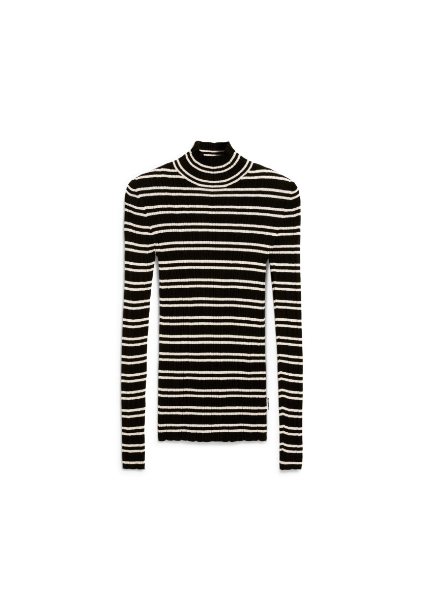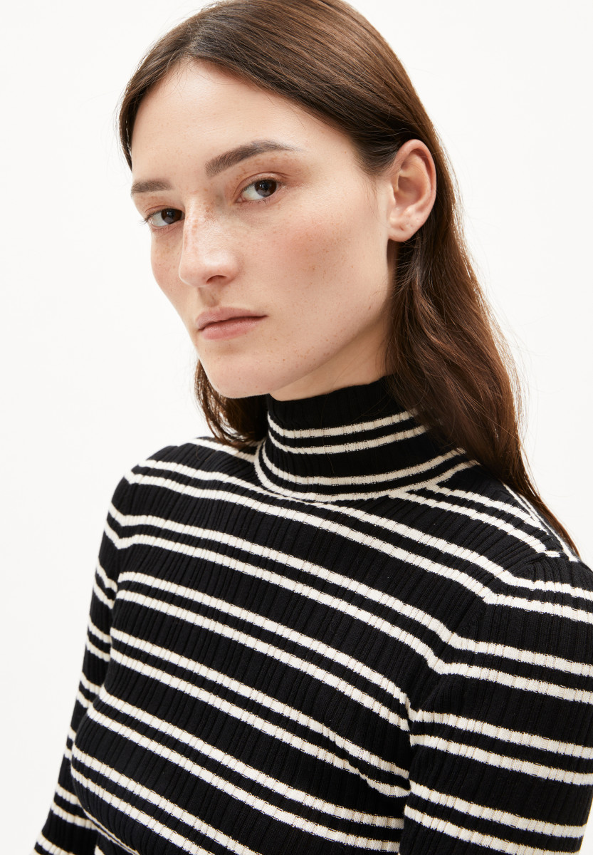 Mit seinem klassischen Streifenmuster und der figurbetonten Passform ist dieser Rollkragenpullover ein echtes Must-have für stilbewusste Frauen. Der feine Rippstrick sorgt für eine angenehme Struktur und perfekten Sitz, während der hohe Kragen wärmt und zugleich modische Akzente setzt.