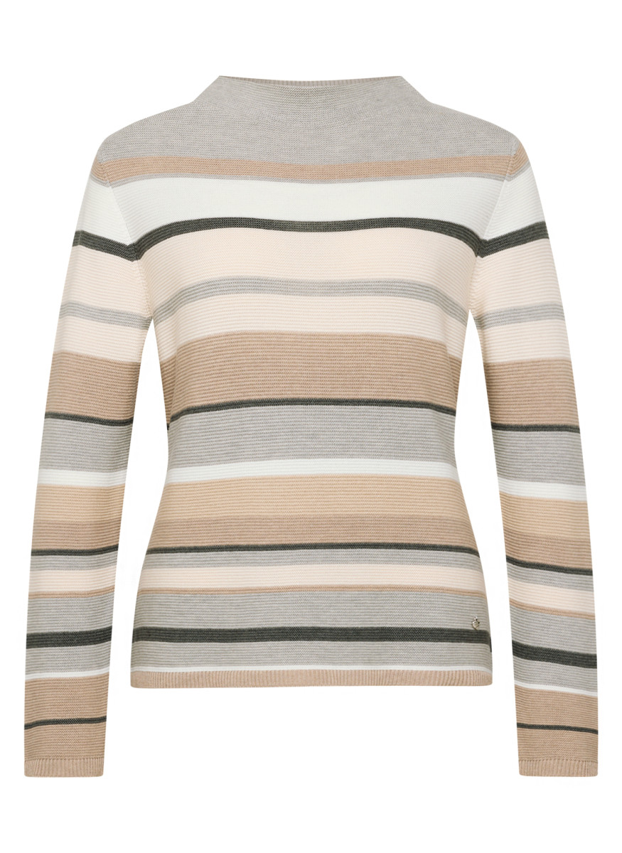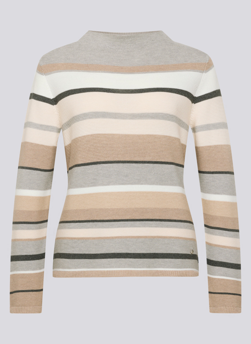 Dieser Pullover kombiniert klassischen Feinstrick mit einem modernen Streifendessin und feiner Struktur. Der kleine Stehkragen verleiht dem Design eine dezente Eleganz, während die weiche Materialmischung aus Baumwolle und Polyacryl für angenehmen Tragekomfort sorgt. Ideal zu kombinieren mit Jeans oder Stoffhosen _ ein vielseitiger Begleiter für die Übergangszeit. Kleiner Stehkragen. Weiche Feinstrickqualität. Gerader Schnitt. Strukturierte Streifenoptik. Angenehmes Tragegefühl durch Materialmix.