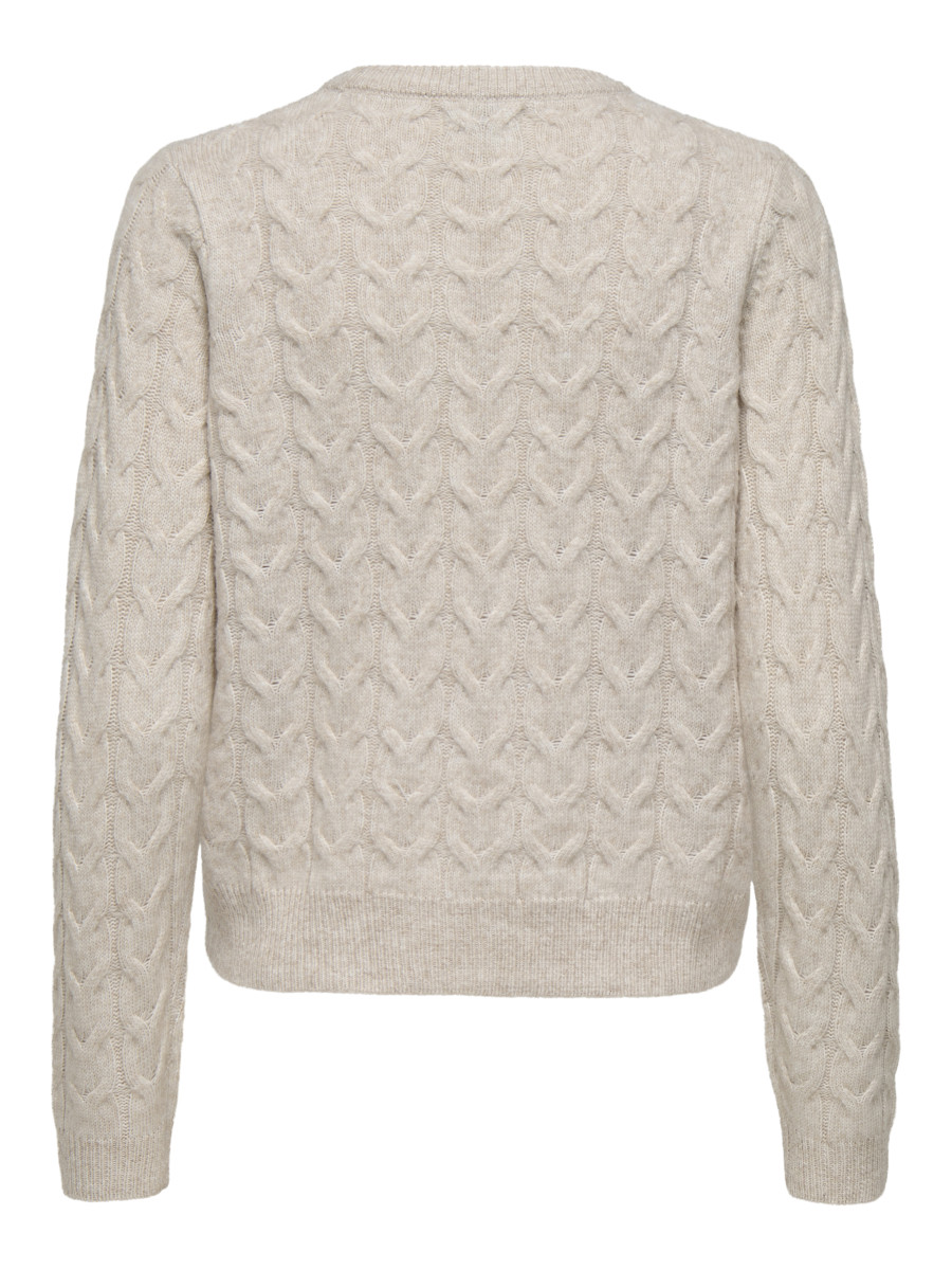 Dieser feminine Pullover von JDY ist ein echtes Highlight für die kühleren Tage. Das klassische, aufwendige Zopfstrickmuster in hellem Beige oder Creme verleiht ihm eine zeitlose, gemütliche Note. Der besondere Charme liegt in den eingearbeiteten, dezenten Perlen-Applikationen, die dem Pullover eine elegante und verspielte Optik verleihen.