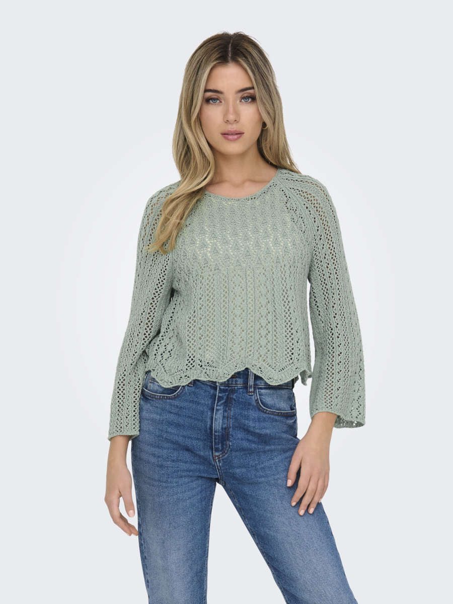 Vervollständige deinen Look mit einem zeitlosen, femininen Strickteil, das weich und warm ist. - Produkttyp : Strickpullover - Hals : Rundhals - Ärmel : 3/4 Arm - Ärmel : Weite Ärmel - Länge/Größe : Verkürzt - Details : Muschelsaum - Passform : Normal geschnitten