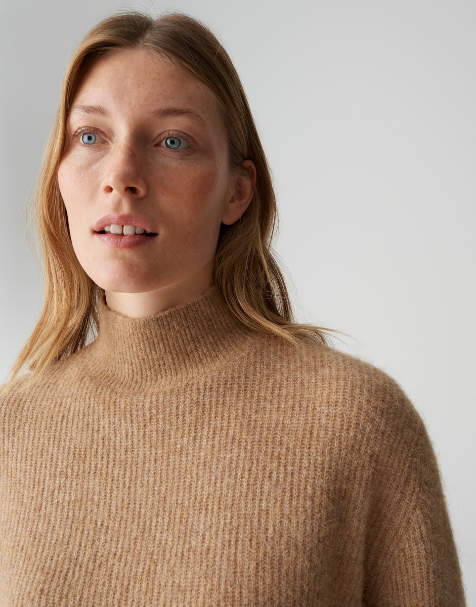 Lockere Passform | Ovaler Schnitt | Langarm | Stehkragen | Feinstrick | Weicher Griff | Flauschige Oberfläche | Strickbündchen | Abnehmbaren Schal