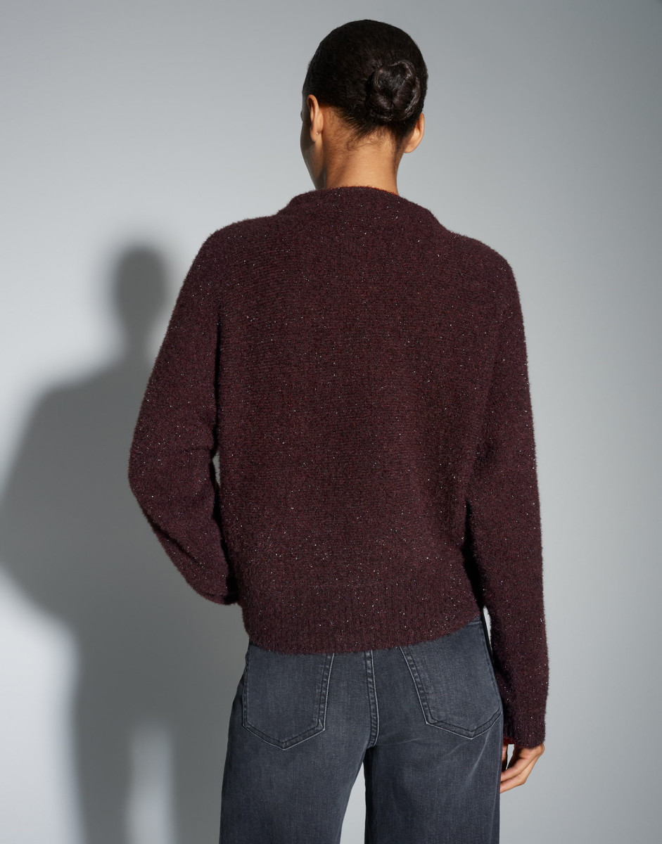 Dieser Pullover ist ein gemütliches und zugleich festliches Key-Piece, das Ihrem Look eine subtile Eleganz verleiht. Er ist aus einem weichen, voluminösen Garn gefertigt, das eine flauschige Textur aufweist. Durch eingearbeitete feine Glitzerfäden oder metallische Fasern erhält das gesamte Oberteil einen dezenten Schimmer, der bei Lichteinfall edel funkelt.