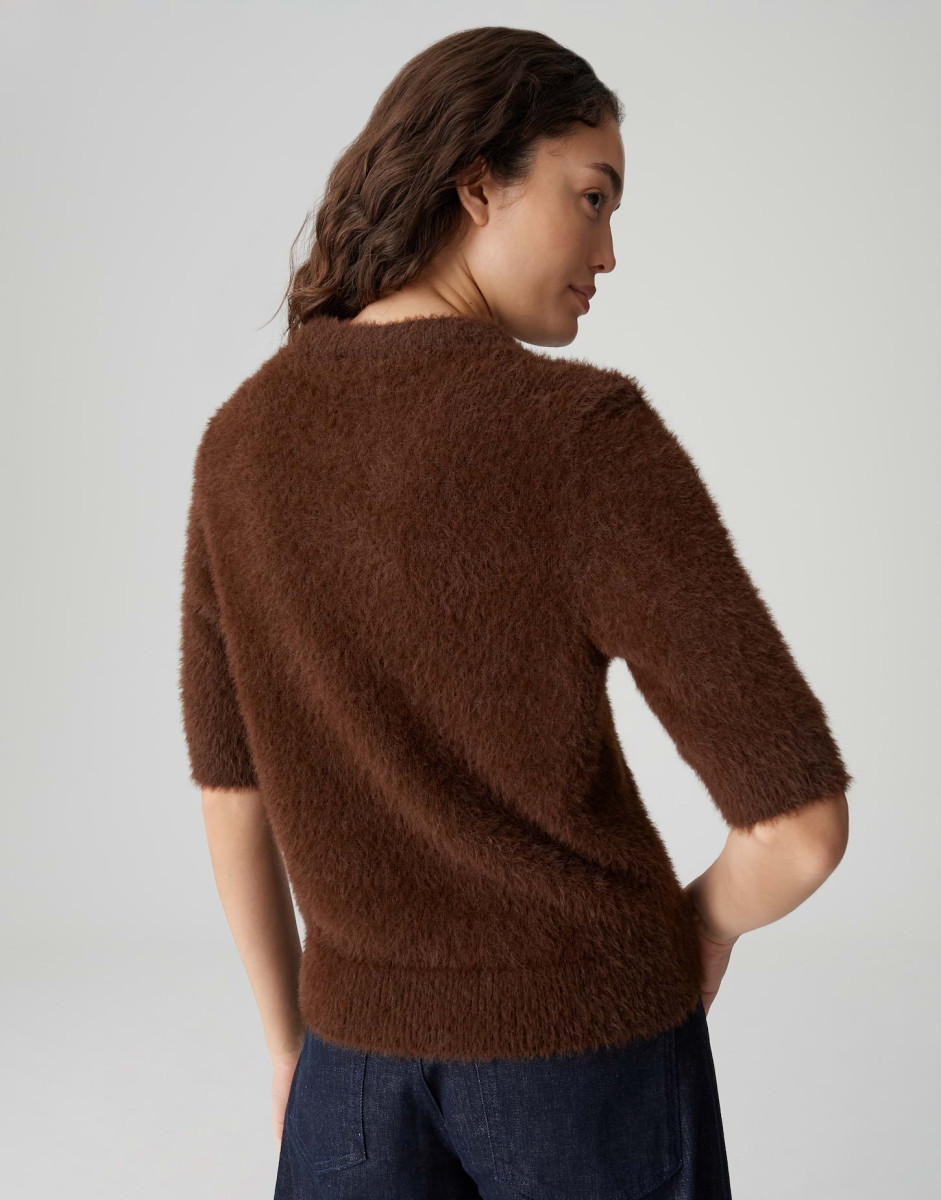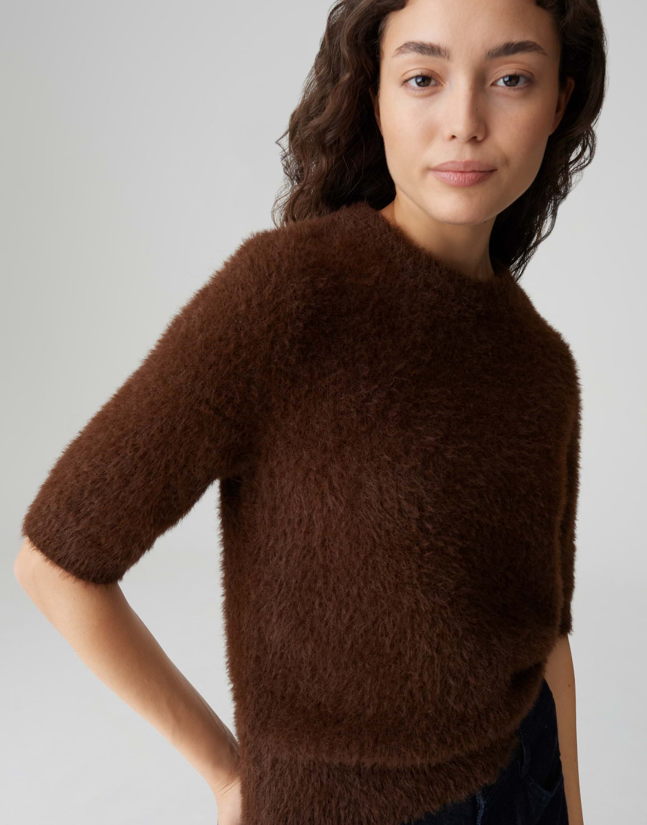 Der Schnitt ist schmal zulaufend und in der Länge verkürzt, was ihn ideal für das Layering über hochgeschnittenen Hosen oder Röcken macht. Er verfügt über einen klassischen Rundhalsausschnitt und modische 3/4-Ärmel, die in feinen Strickbündchen abschließen, ebenso wie der Saum. Mit einer Rückenlänge von circa 54 cm bei Größe 36 ist dieses Oberteil ein stilvolles Basic. Unser Model ist 177 cm groß und trägt Größe 36.