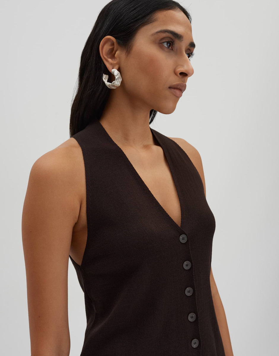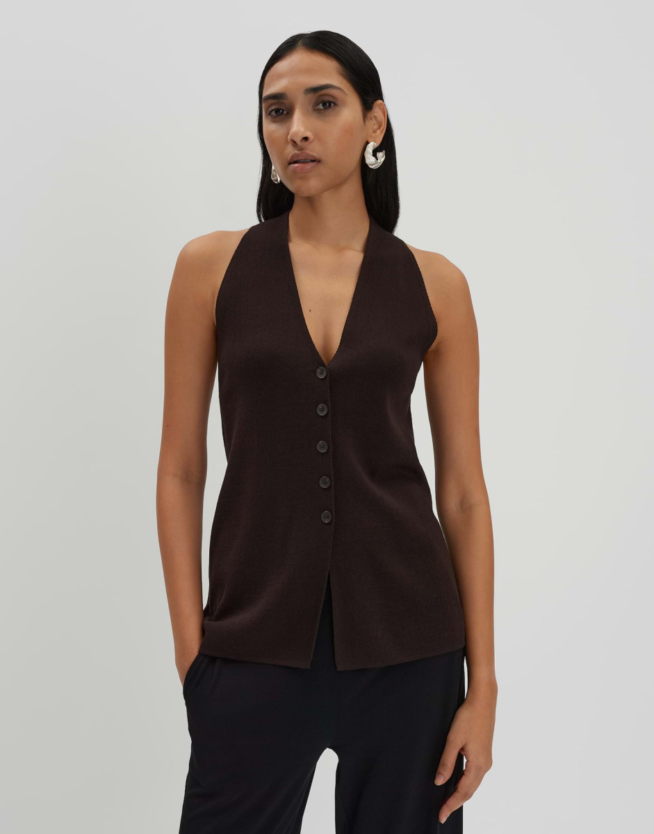 Schmale Passform | Figurbetont geschnitten | Lang geschnitten | Ärmellos | Tiefer V-Ausschnitt | Rückenlänge ca. 64 cm bei Größe 36 | Model Größe 176 cm – trägt Größe 36 | Feinstrick | Glatter Griff | Fließender Fall | Formstabil | Knopfleiste | Racerback