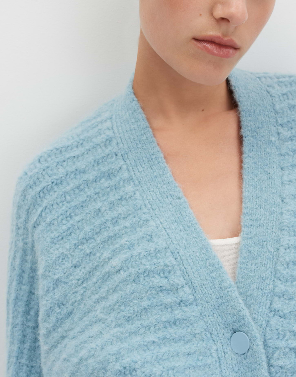 Dieser flauschige Strickcardigan ist das ideale Kleidungsstück für alle, die Wärme und stilvolle Leichtigkeit suchen. Gefertigt aus einem weichen Material mit feiner Struktur, bietet er ein besonders angenehmes Tragegefühl und hält zuverlässig an kühleren Tagen. Der klassische V-Ausschnitt und die durchgehende Knopfleiste ermöglichen vielseitige Styling-Möglichkeiten; tragen Sie ihn zugeknöpft wie einen Pullover oder offen als lässigen Layering-Partner über einem Top oder Hemd. Seine moderne, leicht verkürzte Passform setzt einen trendigen Akzent und lässt sich hervorragend zu hoch geschnittenen Hosen oder Röcken kombinieren. Rippbündchen an den Ärmeln und am Saum sorgen für eine schöne Silhouette und optimalen Sitz. Ein zeitloses Strick-Essential, das jeder Garderobe eine kuschelige und zugleich elegante Note verleiht und sich nahtlos in den Alltag integrieren lässt.