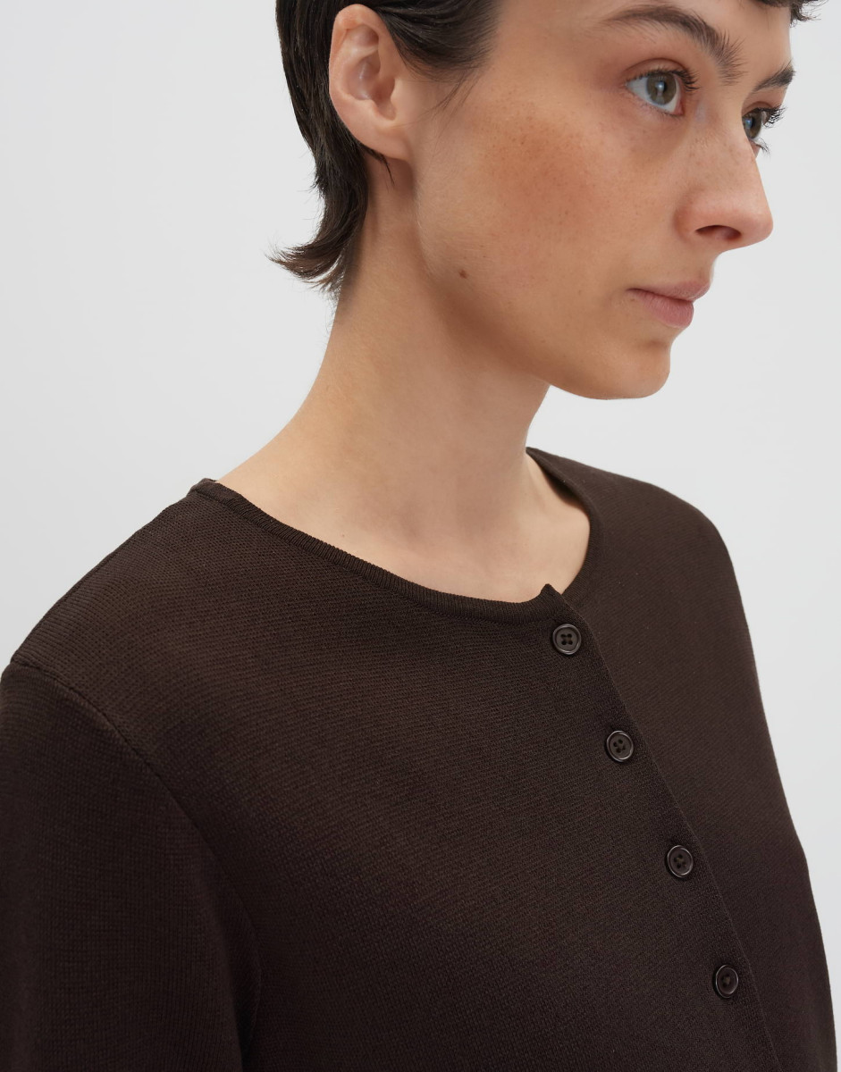 Figurbetonte Passform | Gerader Schnitt | Halbarm | Hoher Rundhalsausschnitt | Rückenlänge ca. 55 cm bei Größe 36 | Model Größe 178 cm – trägt Größe 36 | Feinstrick | Natürlicher Griff | Formstabil | Breiter Ripp-Saum | Knopfleiste vorn
