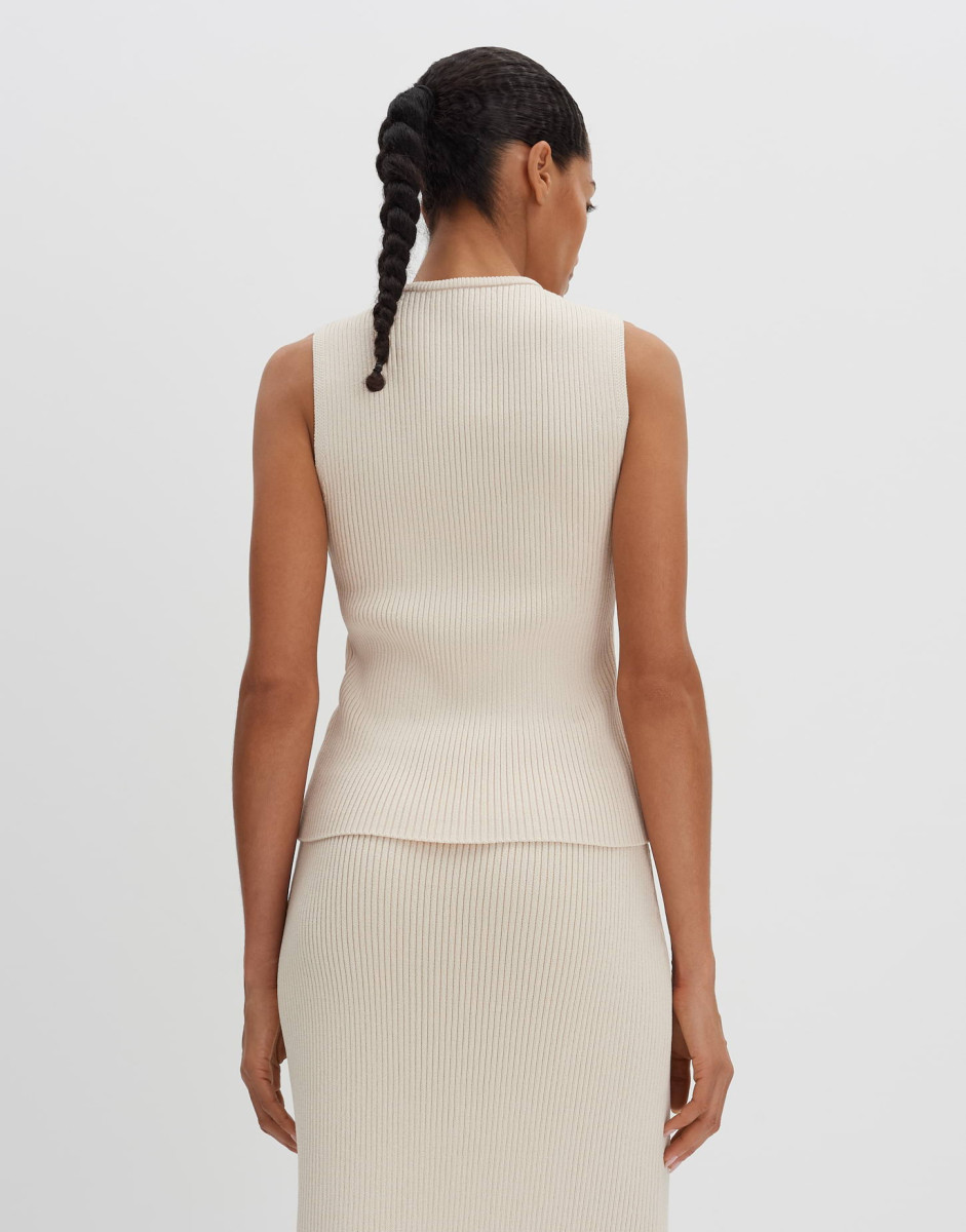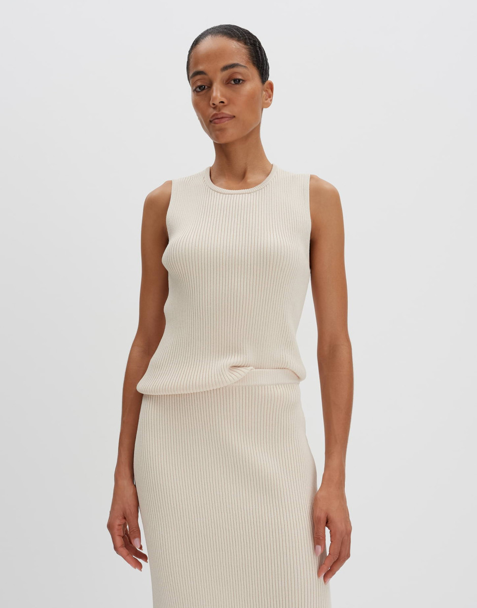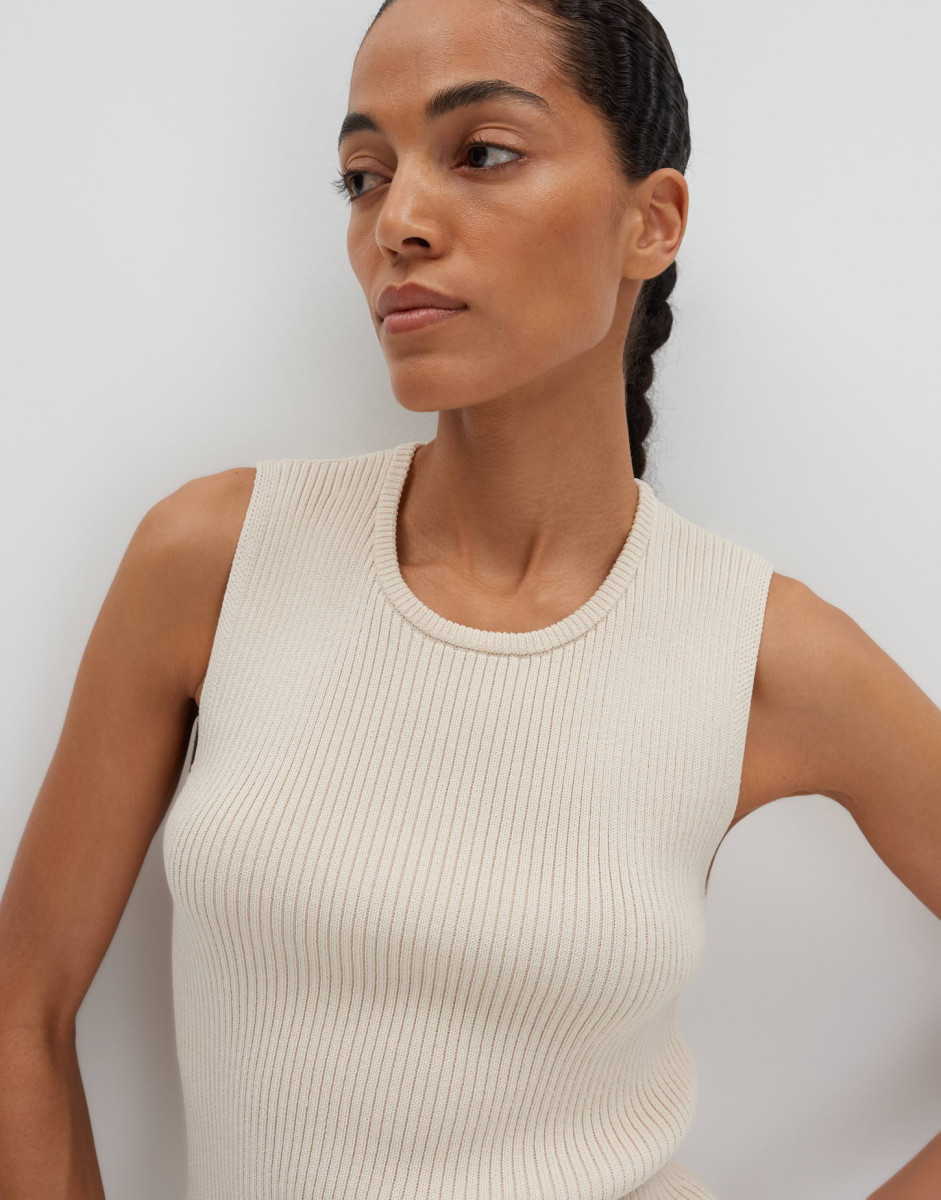 Schmale Passform | Gerader Schnitt | Breiter Träger | Rundhalsausschnitt | Rückenlänge ca. 56 cm bei Größe 36 | Model Größe 179 cm – trägt Größe 36 | Strick | Rippstruktur | Natürlicher Griff | Leicht elastischer Stoff