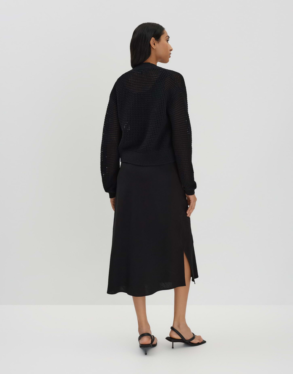 Lockere Passform | Schmal zulaufend | Verkürzte Länge | Langarm | Rückenlänge ca. 50 cm bei Größe 36 | Model Größe 177 cm – trägt Größe 36 | Strick | Weicher Griff | Fließender Fall | Leichte Transparenz | Lochstrick-Muster | Strickbündchen an Ärmel und Saum | Offene Front