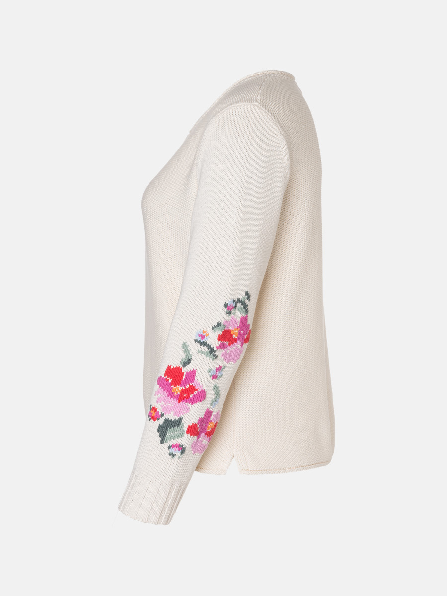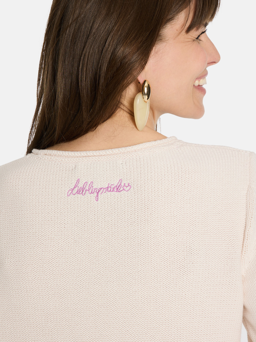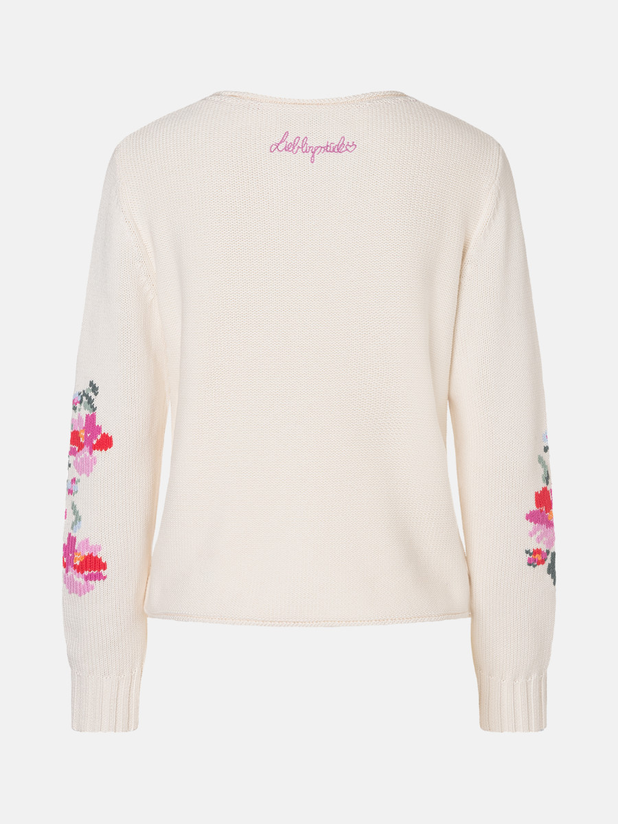 Romantisch, verspielt und zeitlos schön – dieser Pullover in Creme überzeugt durch liebevolle Details und eine angenehme Strickqualität. Der Klassiker in zartem Offwhite wird durch auffällige florale Stickereien an den Ärmeln und am unteren Rücken zum echten Hingucker.