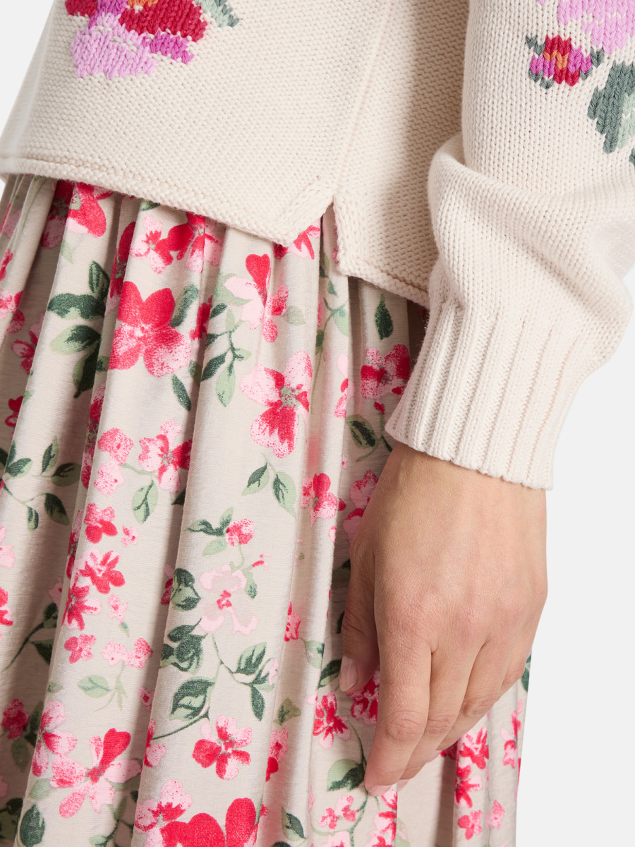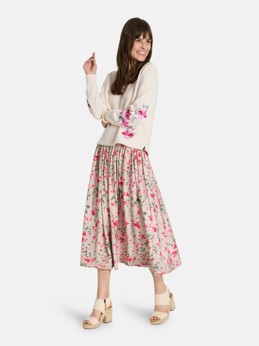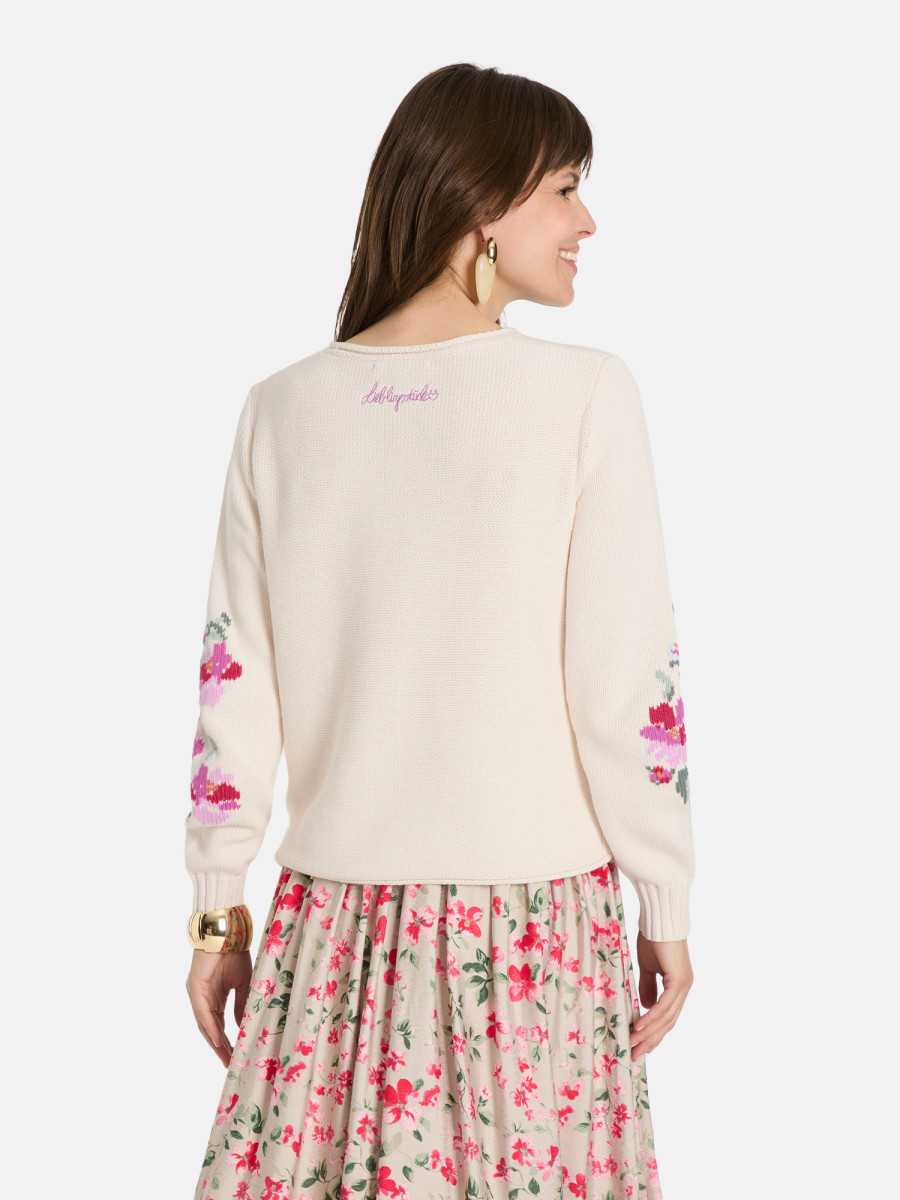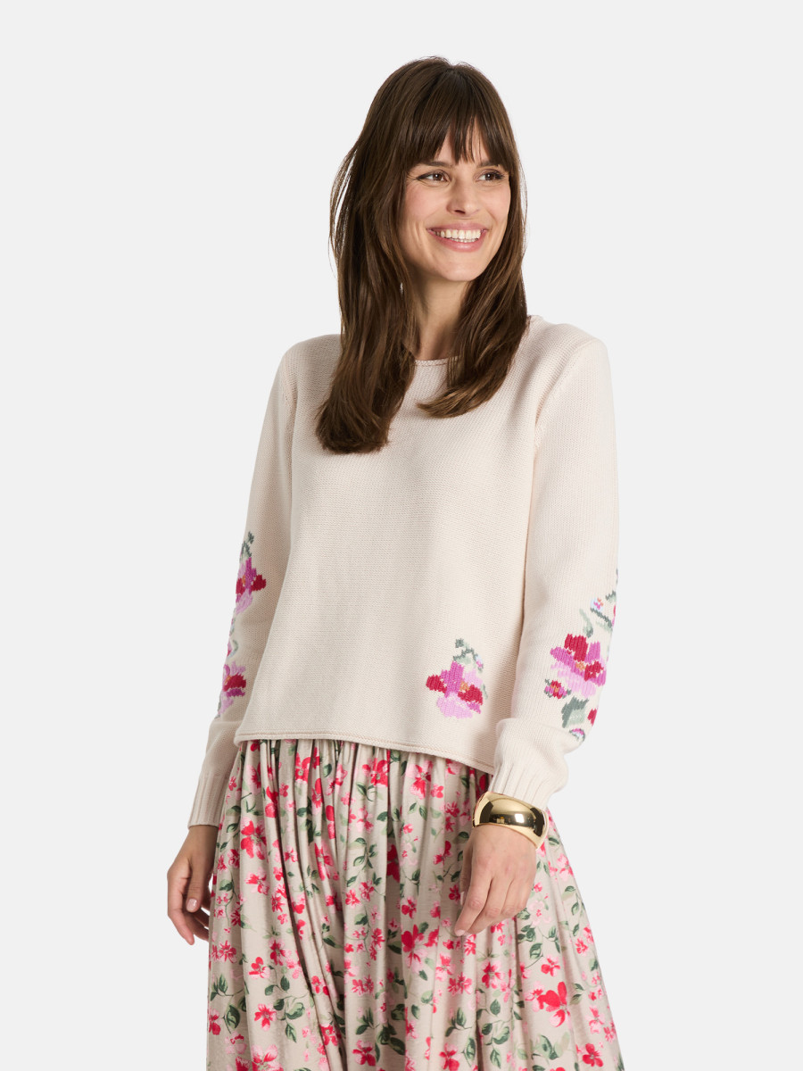 Romantisch, verspielt und zeitlos schön – dieser Pullover in Creme überzeugt durch liebevolle Details und eine angenehme Strickqualität. Der Klassiker in zartem Offwhite wird durch auffällige florale Stickereien an den Ärmeln und am unteren Rücken zum echten Hingucker.