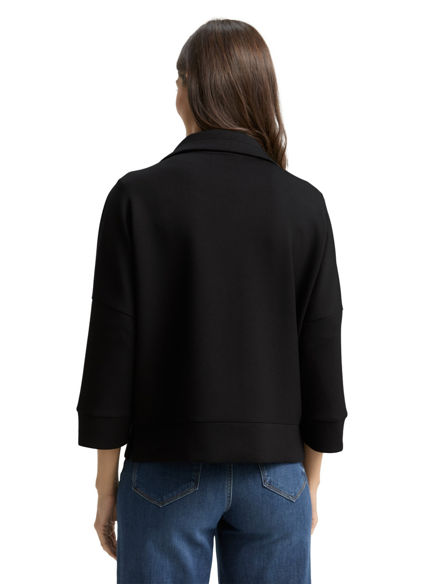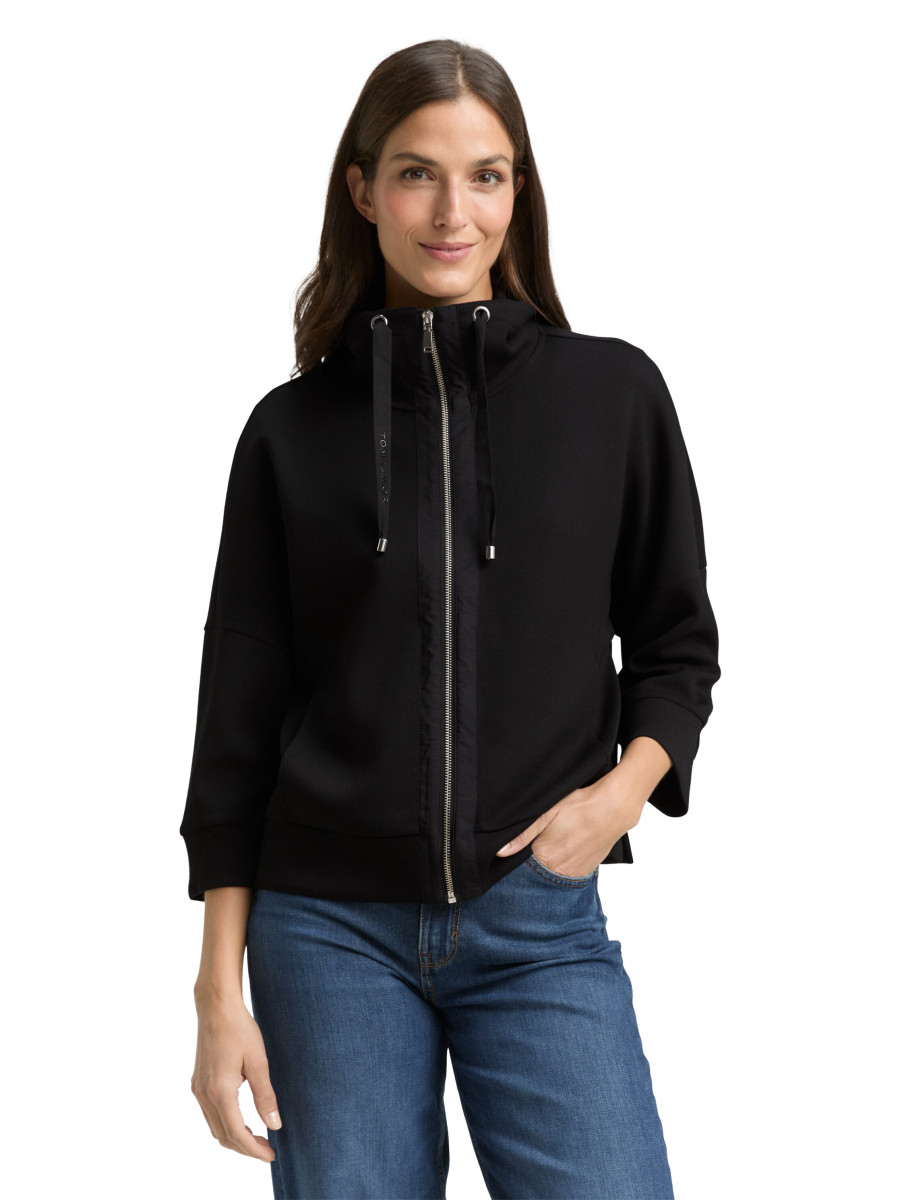 Sweatshirtjacke mit seitlichen Eingriffstaschen und Kordelzug am Kragen. Mit überschnittener Schulternaht und kurzen Seitenschlitzen. Aus einem knitterarmen, elastischen und neoprenähnlichen Scuba-Stoff.