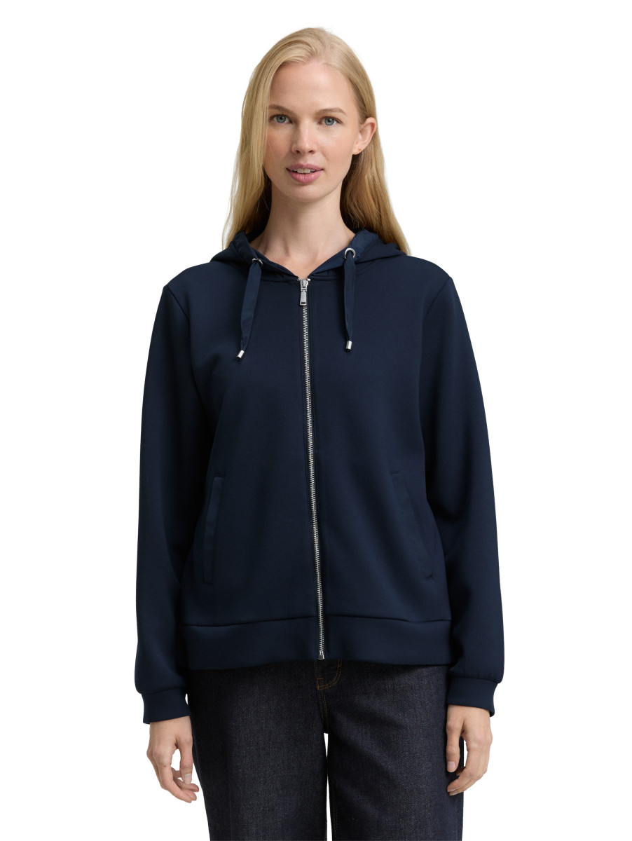 Hoodie Sweatshirtjacke mit Kordelzug an der Kapuze und seitlichen Eingriffstaschen vorne. Aus einem knitterarmen, elastischen und neoprenähnlichen Scuba-Stoff.