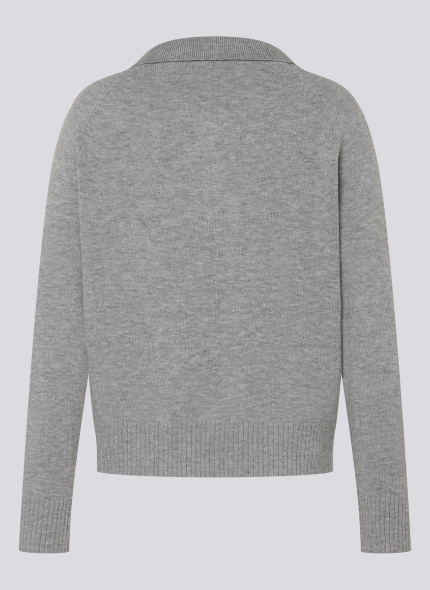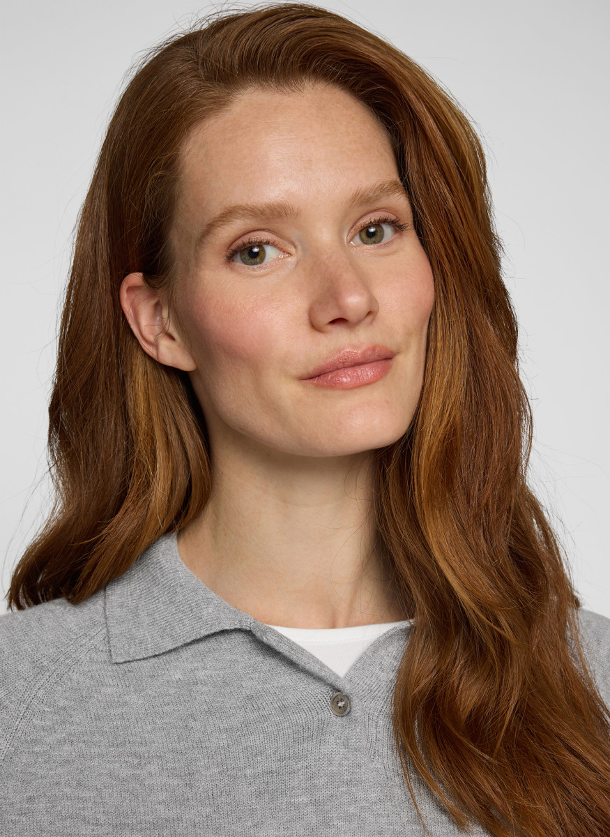 Dieser klassische Polo-Pullover für Damen ist ein zeitloses Basic, das Komfort und schlichte Eleganz vereint. Gefertigt aus weichem, meliertem Strickmaterial in einem vielseitigen Hellgrau, ist er die perfekte Ergänzung für jede Garderobe. Der Pullover verfügt über einen traditionellen Polo-Kragen mit V-Ausschnitt und einem Knopf, der dem Design einen sportlich-eleganten Touch verleiht.