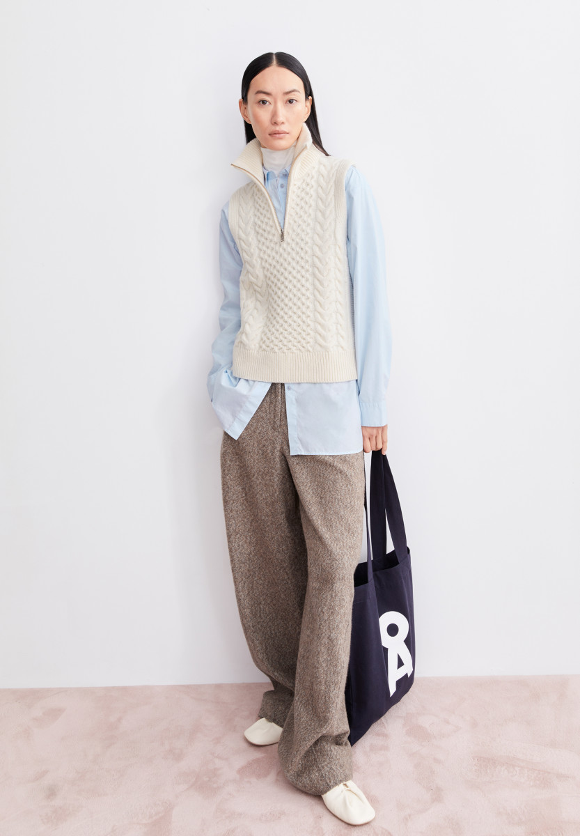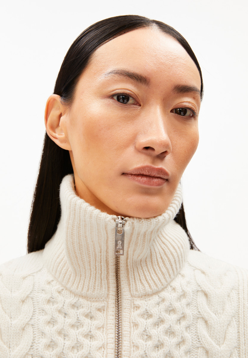 Das OLAIAAS CABLE Stricktop aus grobem Zopfmuster-Strick kombiniert einen ärmellosen Schnitt mit Troyerkragen und Reißverschluss. Die lockere Silhouette sorgt für modernen Komfort, während die Mischung aus Bio- und recycelter Wolle atmungsaktive Wärme bietet.