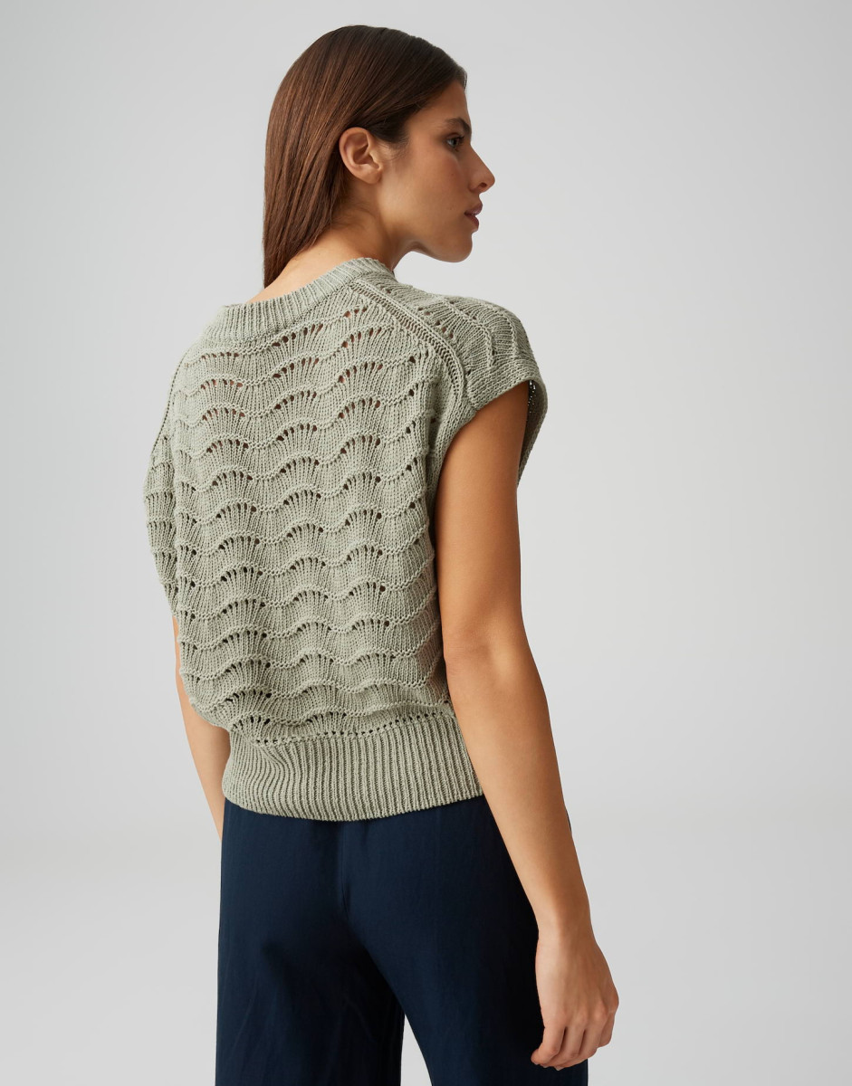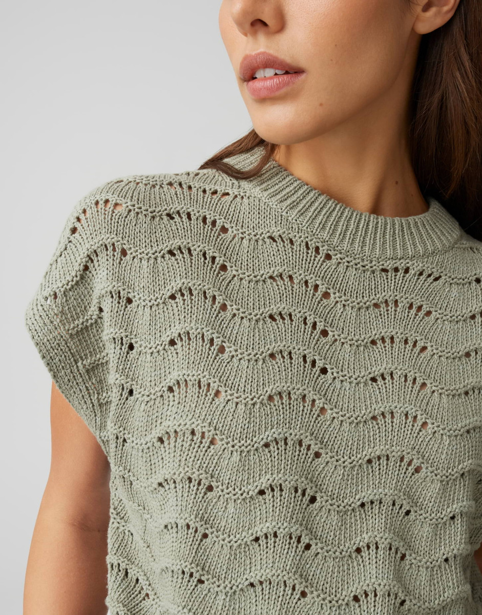 Das sanft strukturierte Wellenmuster macht das Stricktop PYDRA zum sommerlichen Key Piece, dessen mercerisierte Baumwolle durch ihre glatte, leicht glänzende und kühle Oberfläche überzeugt. Kombiniert mit High Waist Denim und schlichtem Top wirkt das Styling casual, modern und citytauglich.