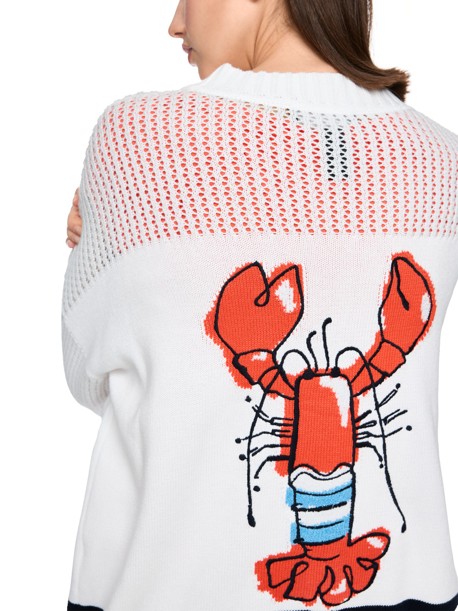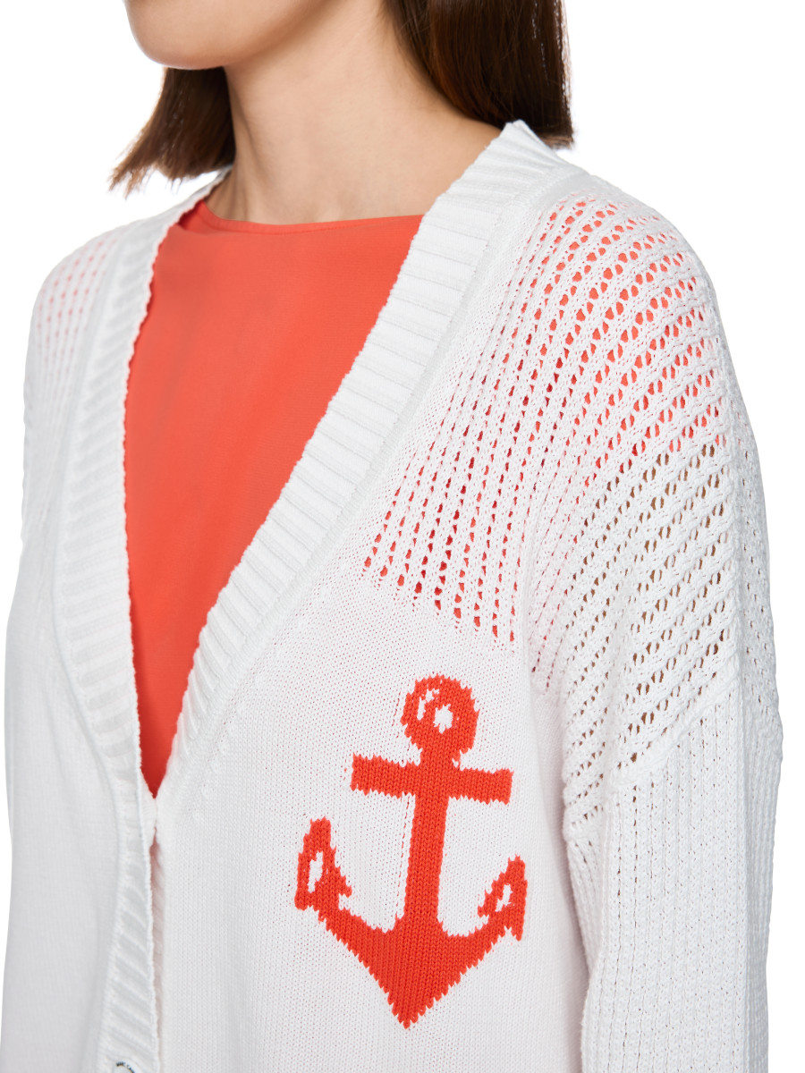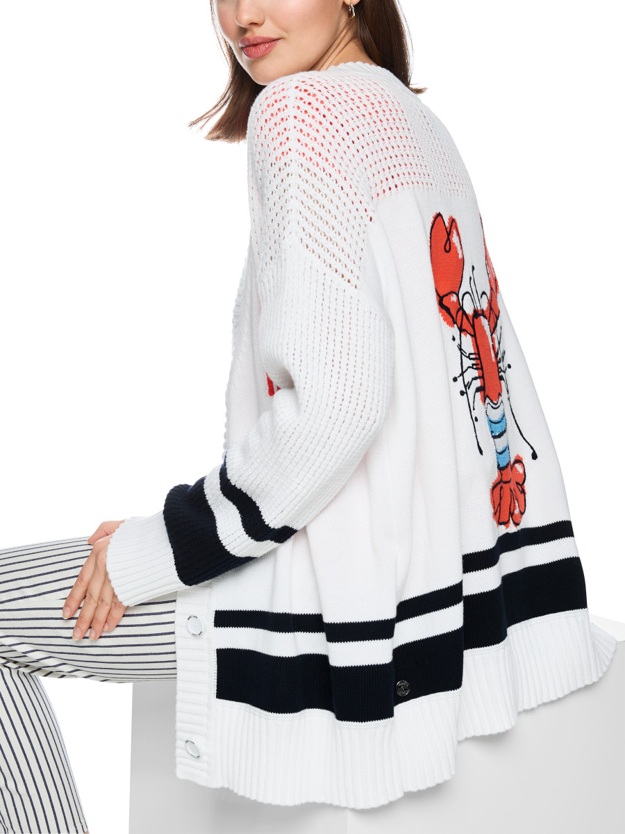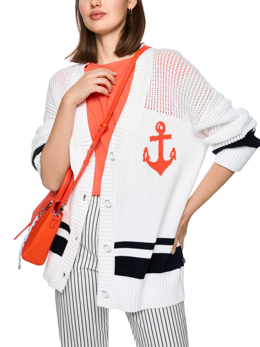 Weit geschnittener Cardigan im maritimen Stil mit überschnittenen Schultern, der durch ein großzügiges Lochstrick-Muster im oberen Bereich besticht. Am Saum sorgen dunkelblaue Streifen für einen maritimen Akzent und auf der Rückseite setzt eine großflächige Hummer-Stickerei ein auffälliges Highlight. Der Cardigan schließt mit einer Knopfleiste und ist aus Baumwolle gefertigt, was für einen angenehm weichen Tragekomfort sorgt.Lief.-Art-Nr: AS 39.14 M61