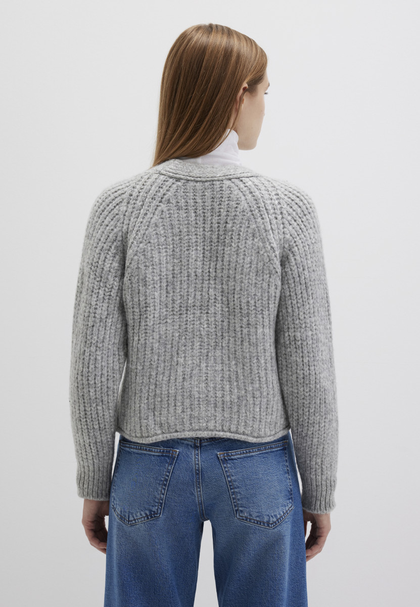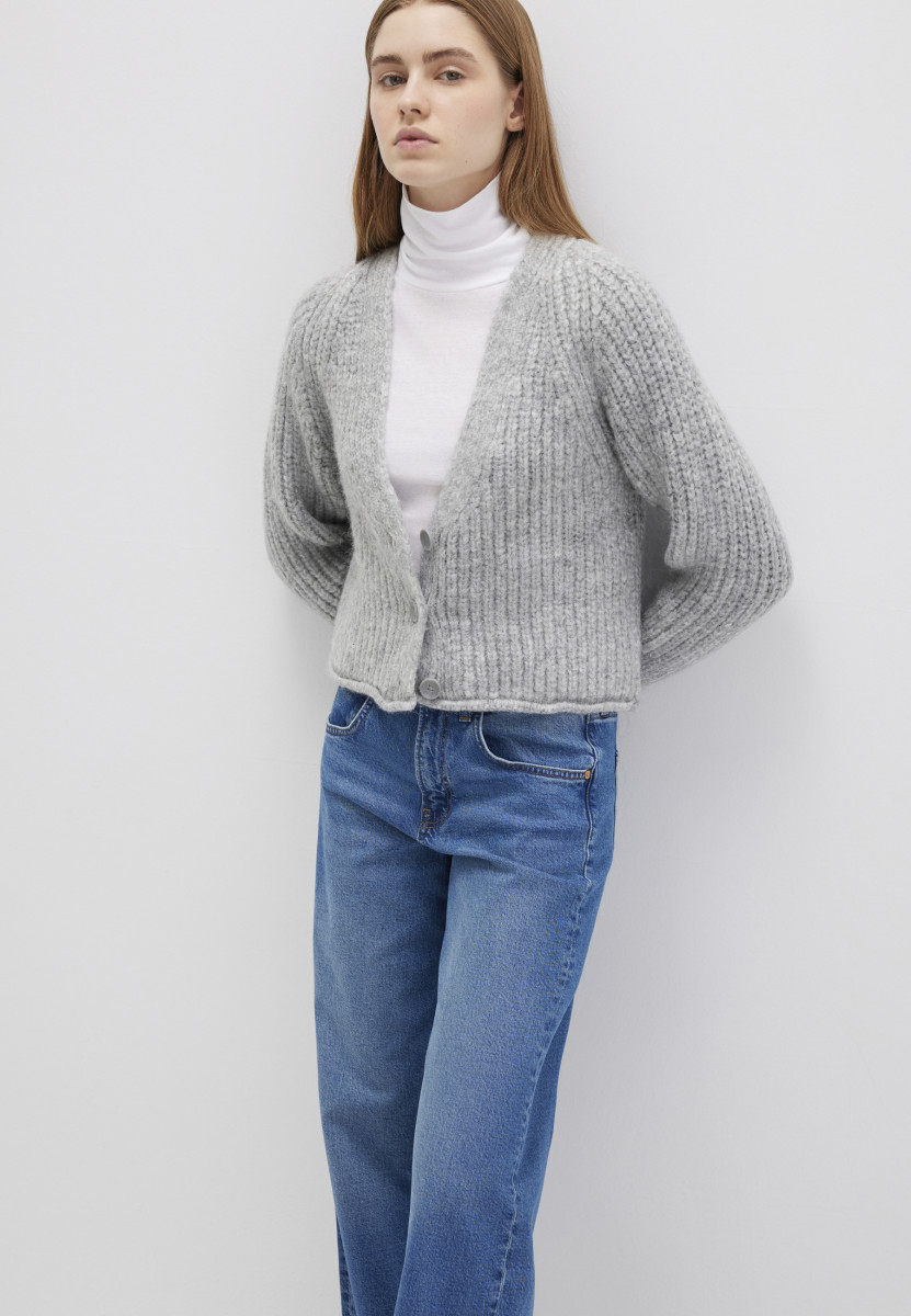 Diese graue Damen-Strickjacke vereint zeitlose Eleganz mit gemütlichem Tragekomfort. Der weiche, grob gestrickte Stoff hält angenehm warm, während der tiefe V-Ausschnitt und die große Knopfleiste dem Cardigan eine moderne Note verleihen. Mit ihrer leicht verkürzten Passform und den voluminösen Ärmeln passt die Strickjacke perfekt zu High-Waist-Jeans, Röcken oder über einem Kleid – ideal für stylische Layering-Looks in der Übergangszeit oder an kühlen Tagen. Ob im Büro, beim Stadtbummel oder für entspannte Stunden zu Hause – dieser Cardigan ist ein echtes Allround-Talent in deiner Garderobe.