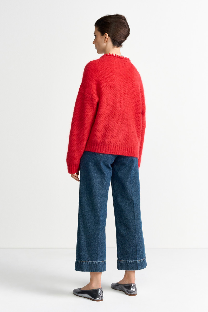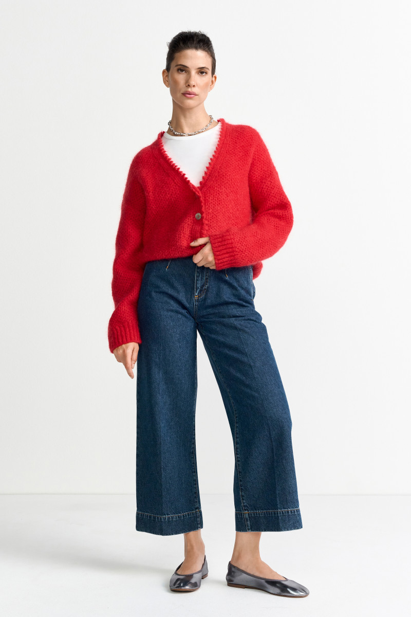 Diese kurze Strickjacke ist ein feminines und verspieltes Oberteil, das durch seine luxuriöse Haptik und die liebevollen Details besticht. Gefertigt aus einem weichen, leicht flauschigen Mohair-ähnlichen Garn, bietet sie höchsten Tragekomfort und hält angenehm warm. Der Schnitt ist leicht kastig und verkürzt, was sich ideal zu hoch geschnittenen Unterteilen kombinieren lässt. Sie verfügt über einen klassischen V-Ausschnitt, der mit einer wellenförmigen, dekorativen Kante verziert ist. Eine Knopfleiste mit kleinen, glänzenden Knöpfen schließt die Jacke. Die langen Ärmel sind schlicht gehalten. Dieses stilvolle Piece ist perfekt, um jedem Outfit eine farbenfrohe und gemütliche Textur zu verleihen und kann als Cardigan oder solo als Pullover getragen werden.