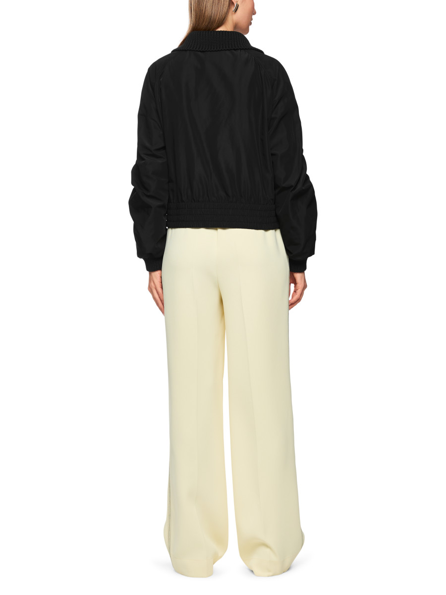 Lässige Strickjacke aus einer trendigen Materialmischung. Die Vorderseite, der Kragen und die Ärmelbündchen sind mit weichem Strickstoff verziert, während die Ärmel aus einem sportlichen Material mit Rüschen gefertigt sind. Dieses Kleidungsstück ist Knitted in Germany: Die Garne werden auf modernsten Strickmaschinen verarbeitet und die Materialien werden in Deutschland veredelt. Die einzelnen Teile, wie Ärmel und Vorderseite, werden bei europäischen Partnerunternehmen zusammengenäht.